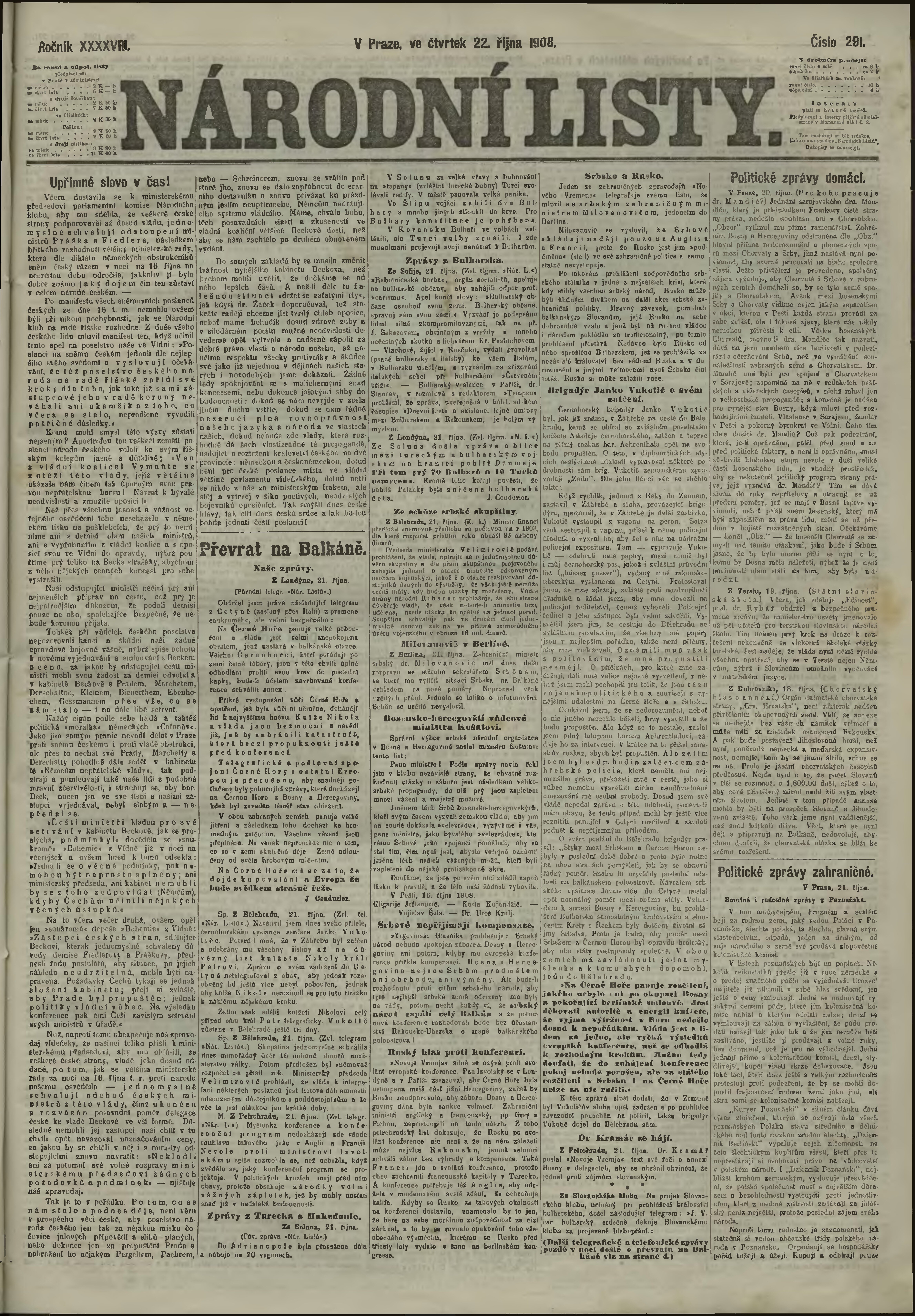 * Datum vydání výtisku: 22.10.1908 Číslo výtisku: 291 Poznámky k výtisku: ranní vydání;