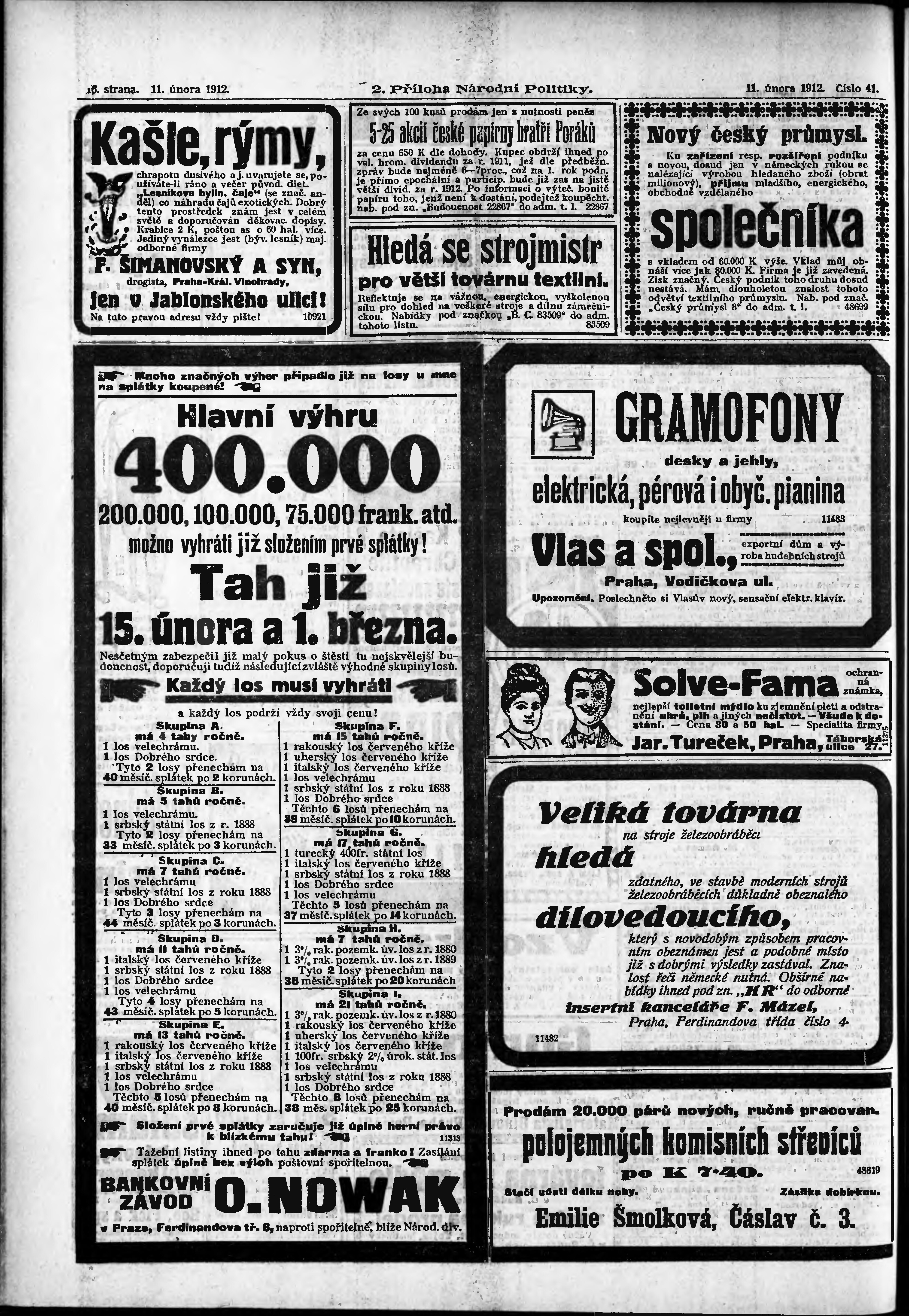 * Datum vydání výtisku: 11.2.1912 Číslo výtisku: 41 Typ výtisku: příloha Poznámky k výtisku: 2. příloha; obsahuje č. 6 Herold českoslovanského peněžnictví;