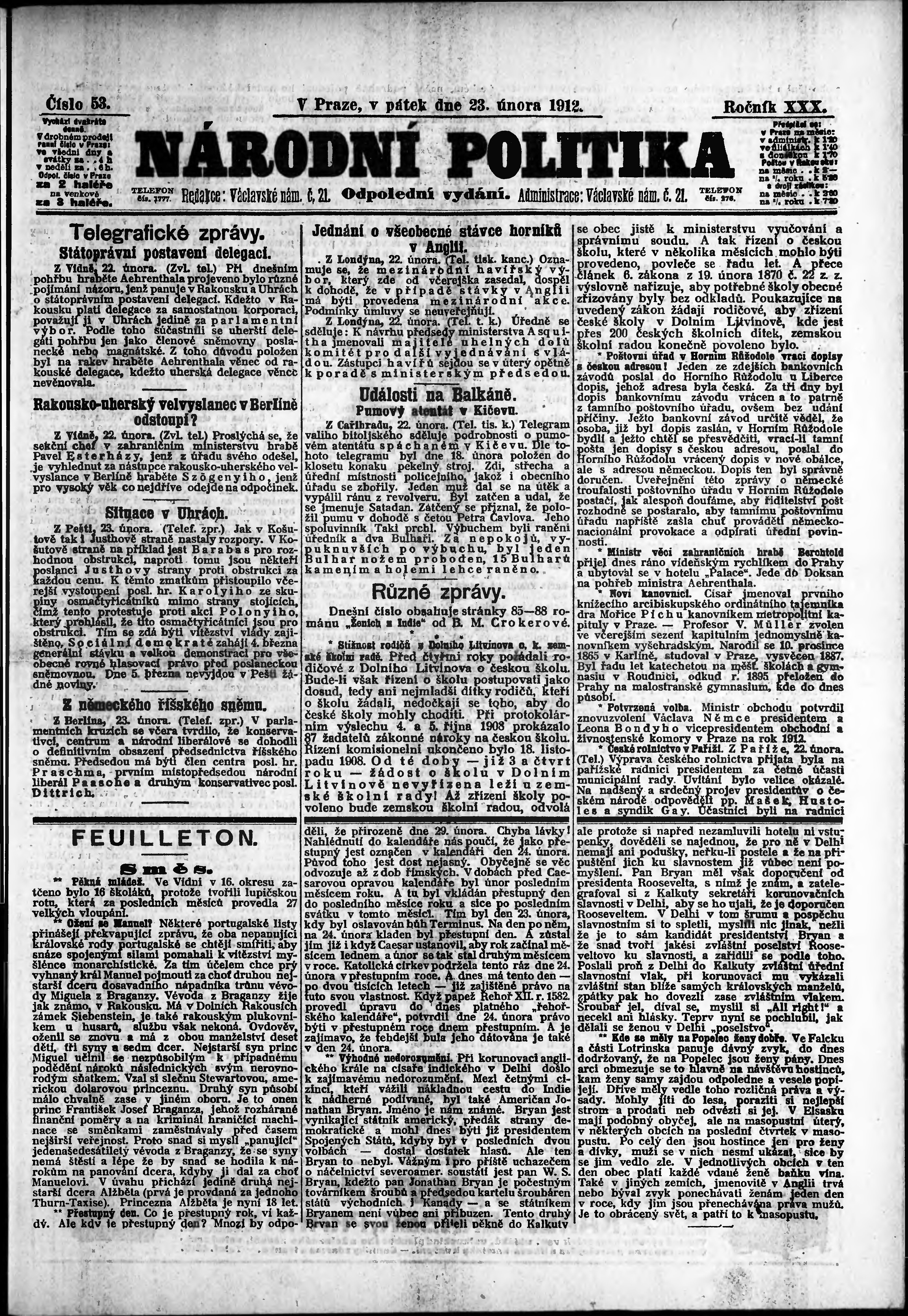 * Datum vydání výtisku: 23.2.1912 Číslo výtisku: 53 Poznámky k výtisku: odpolední vydání;