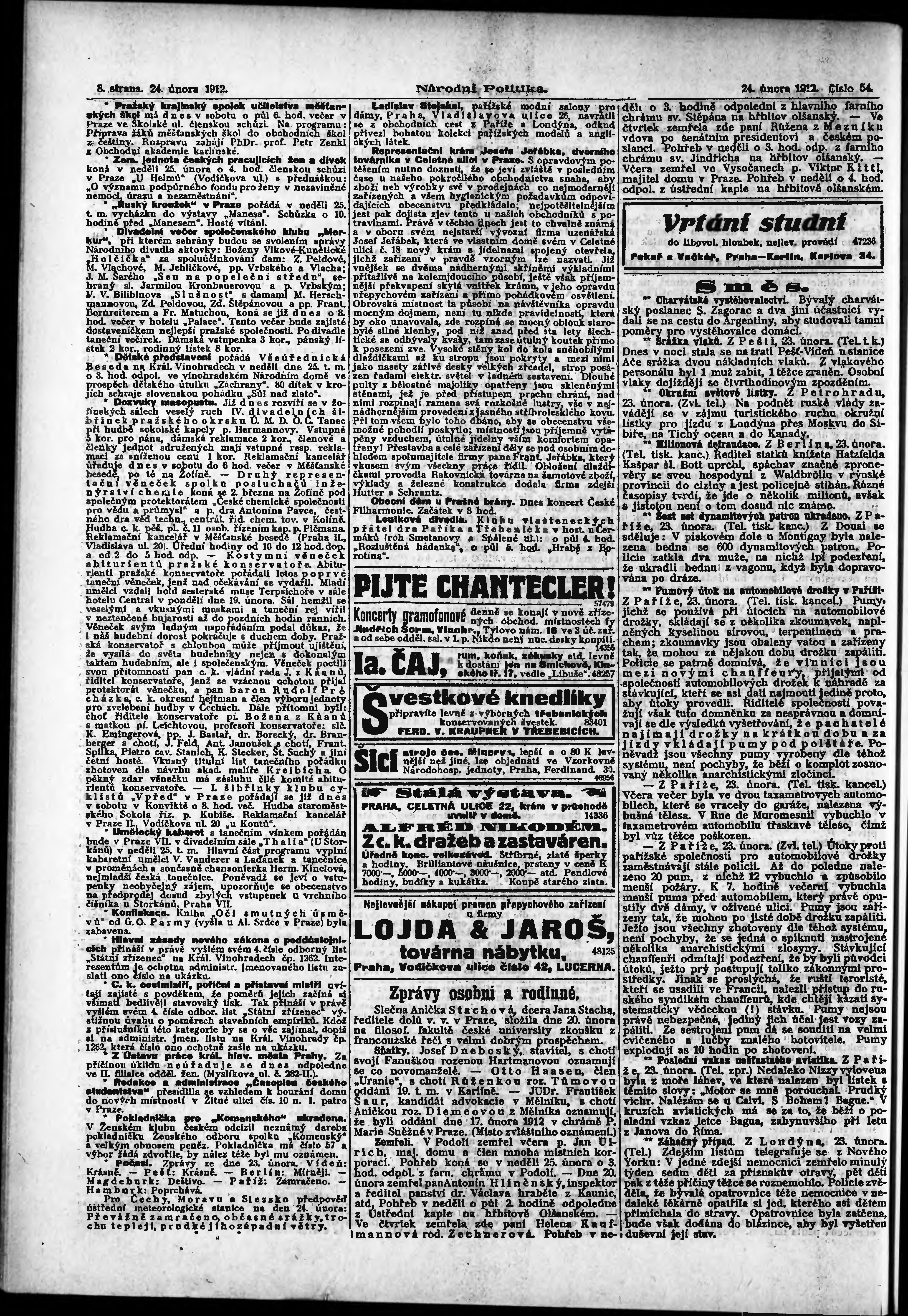 * Datum vydání výtisku: 24.2.1912 Číslo výtisku: 54 Poznámky k výtisku: ranní vydání;