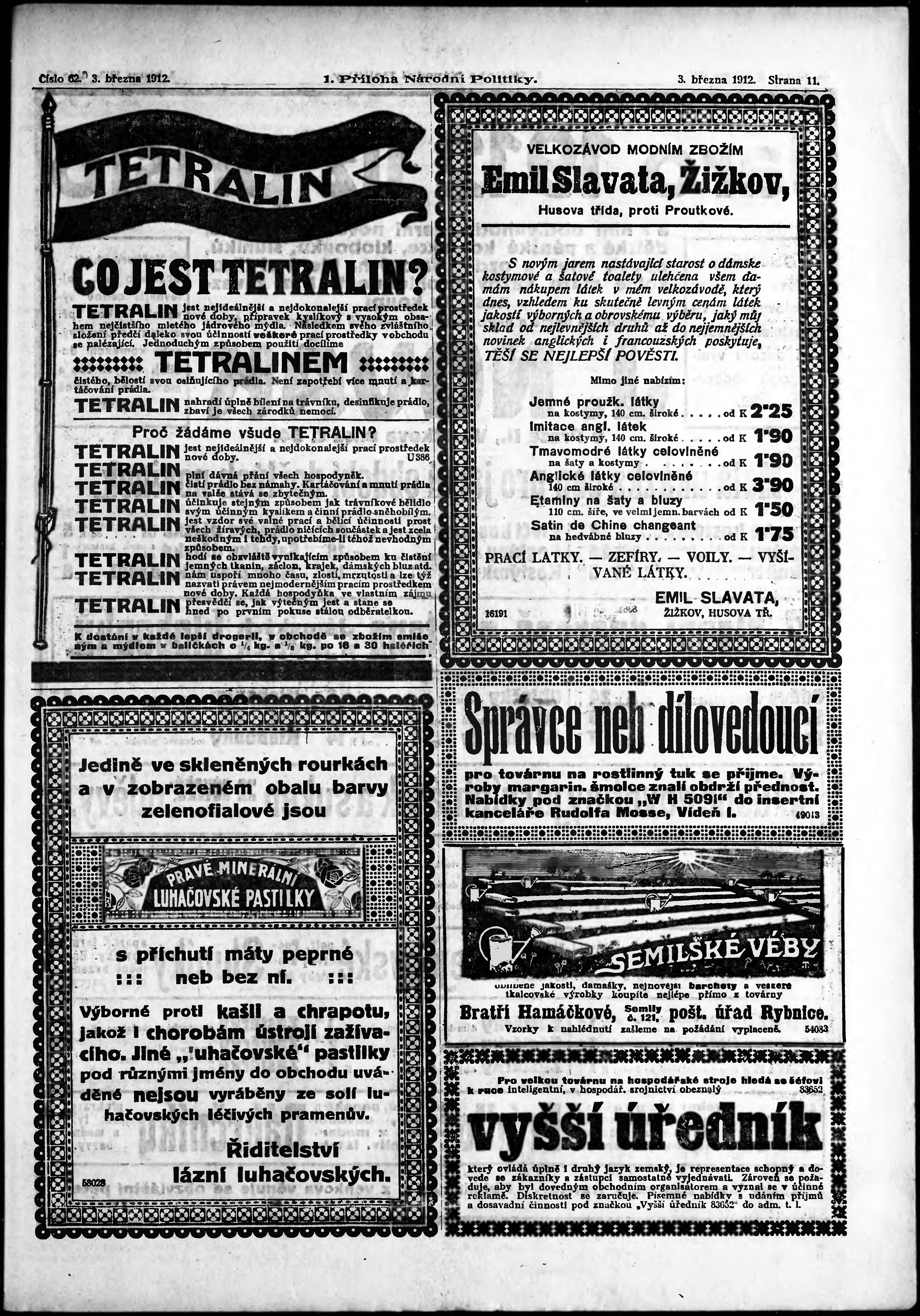* Datum vydání výtisku: 3.3.1912 Číslo výtisku: 62 Typ výtisku: příloha Poznámky k výtisku: 1. příloha;