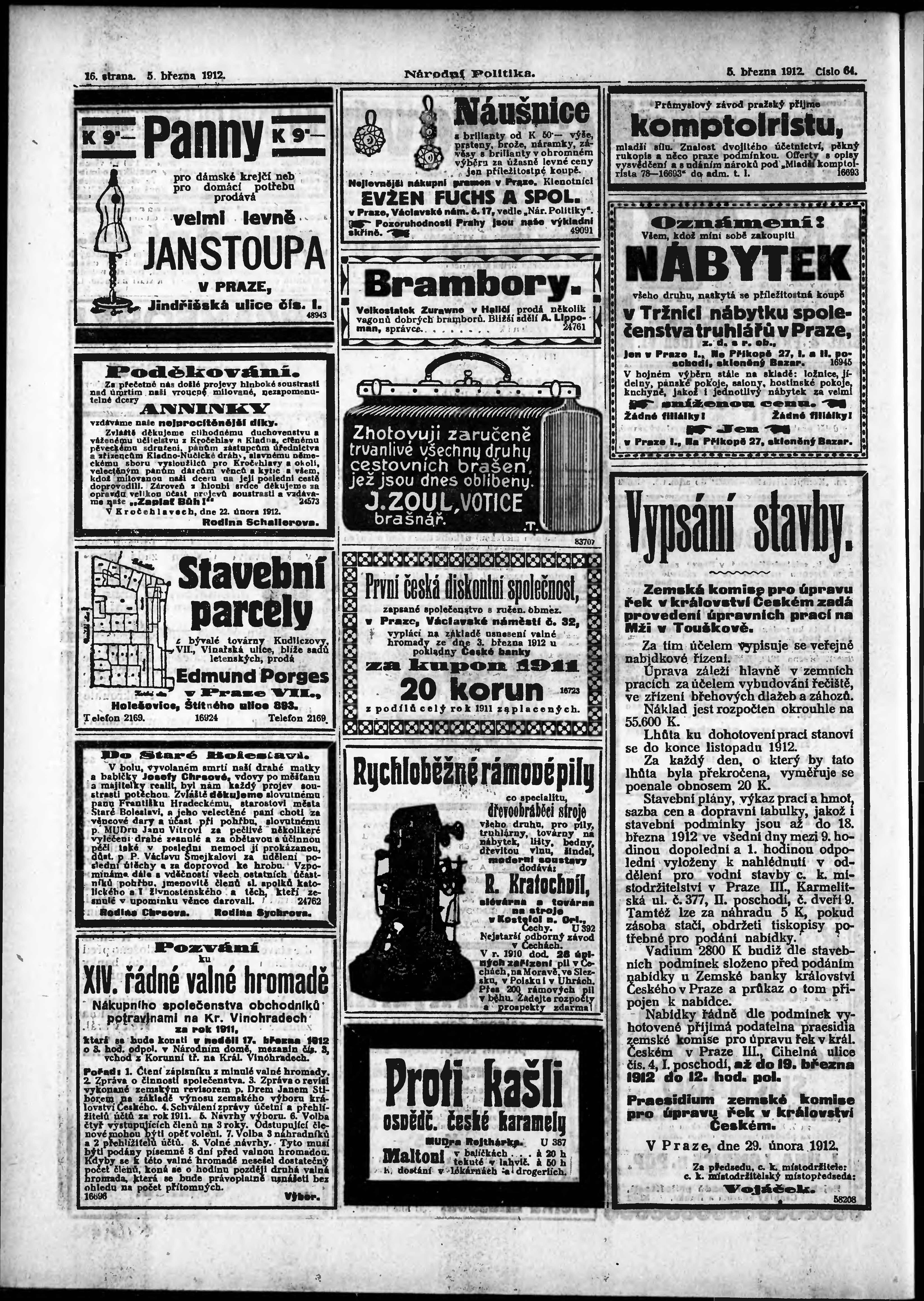 * Datum vydání výtisku: 5.3.1912 Číslo výtisku: 64 Poznámky k výtisku: ranní vydání;