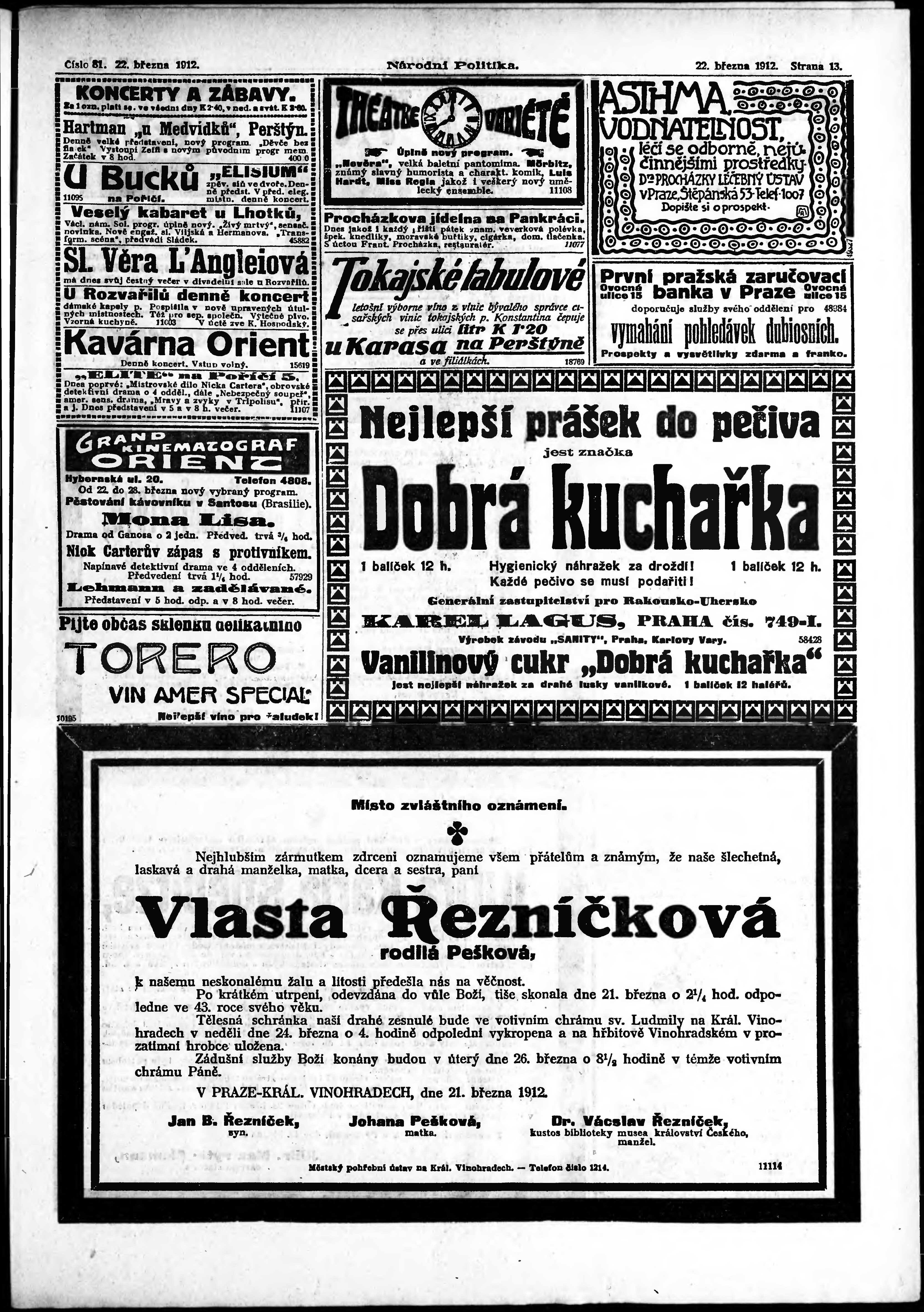 * Datum vydání výtisku: 22.3.1912 Číslo výtisku: 81 Poznámky k výtisku: ranní vydání;