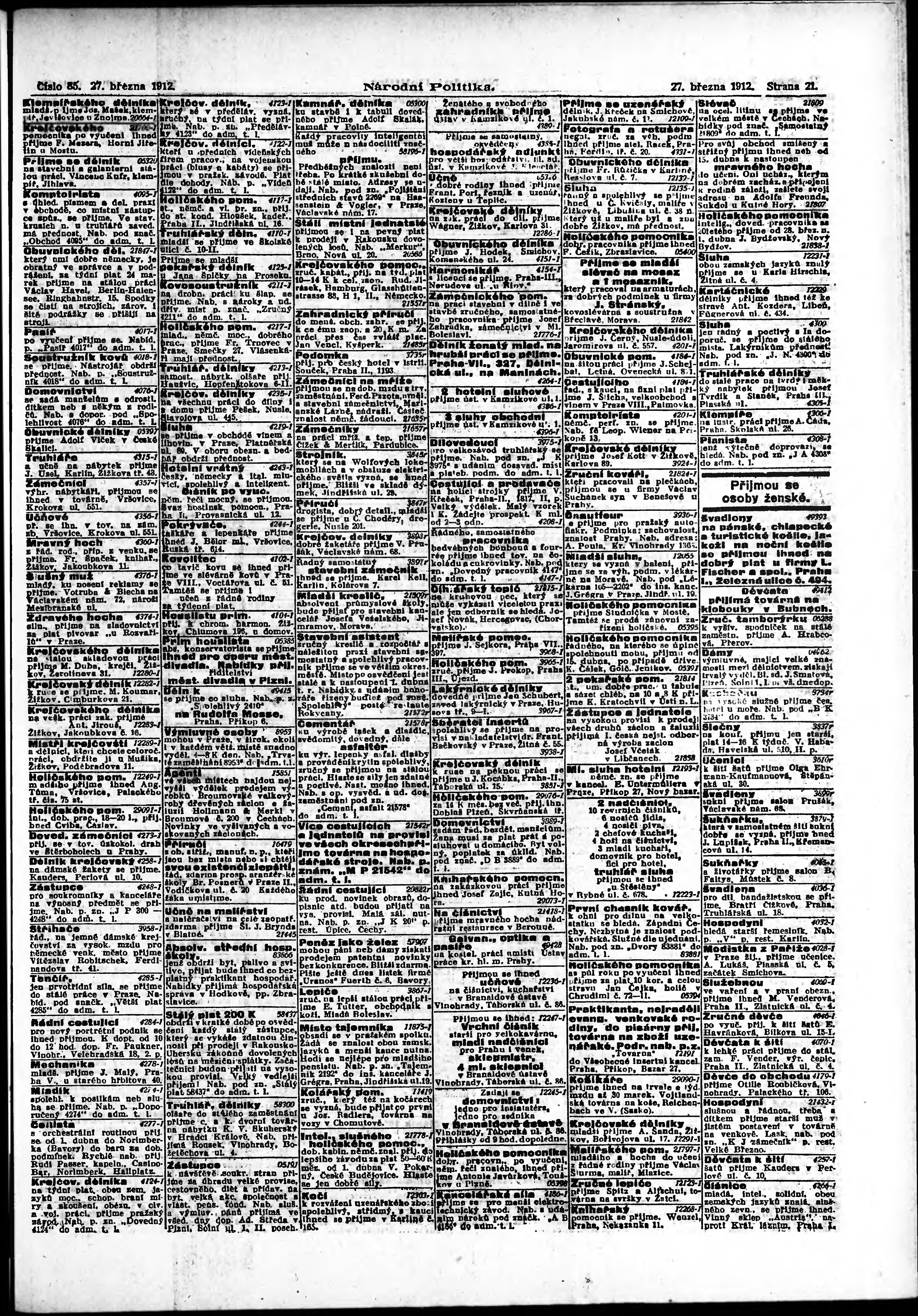 * Datum vydání výtisku: 27.3.1912 Číslo výtisku: 85 Poznámky k výtisku: ranní vydání; s. 15 - 16 není k dispozici;