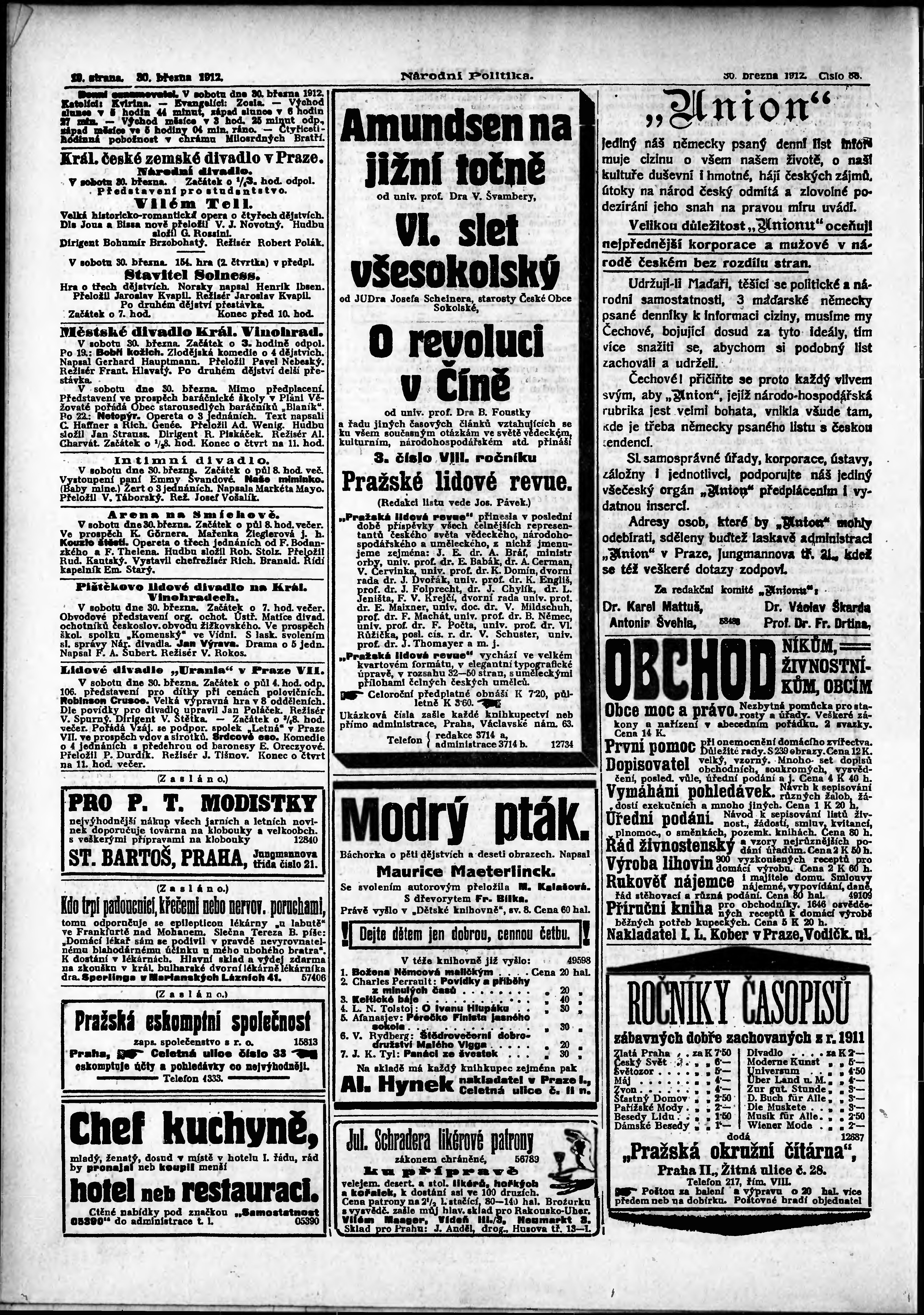 * Datum vydání výtisku: 30.3.1912 Číslo výtisku: 88 Poznámky k výtisku: ranní vydání; s. 15 - 16, 19 - 20 není k dispozici;