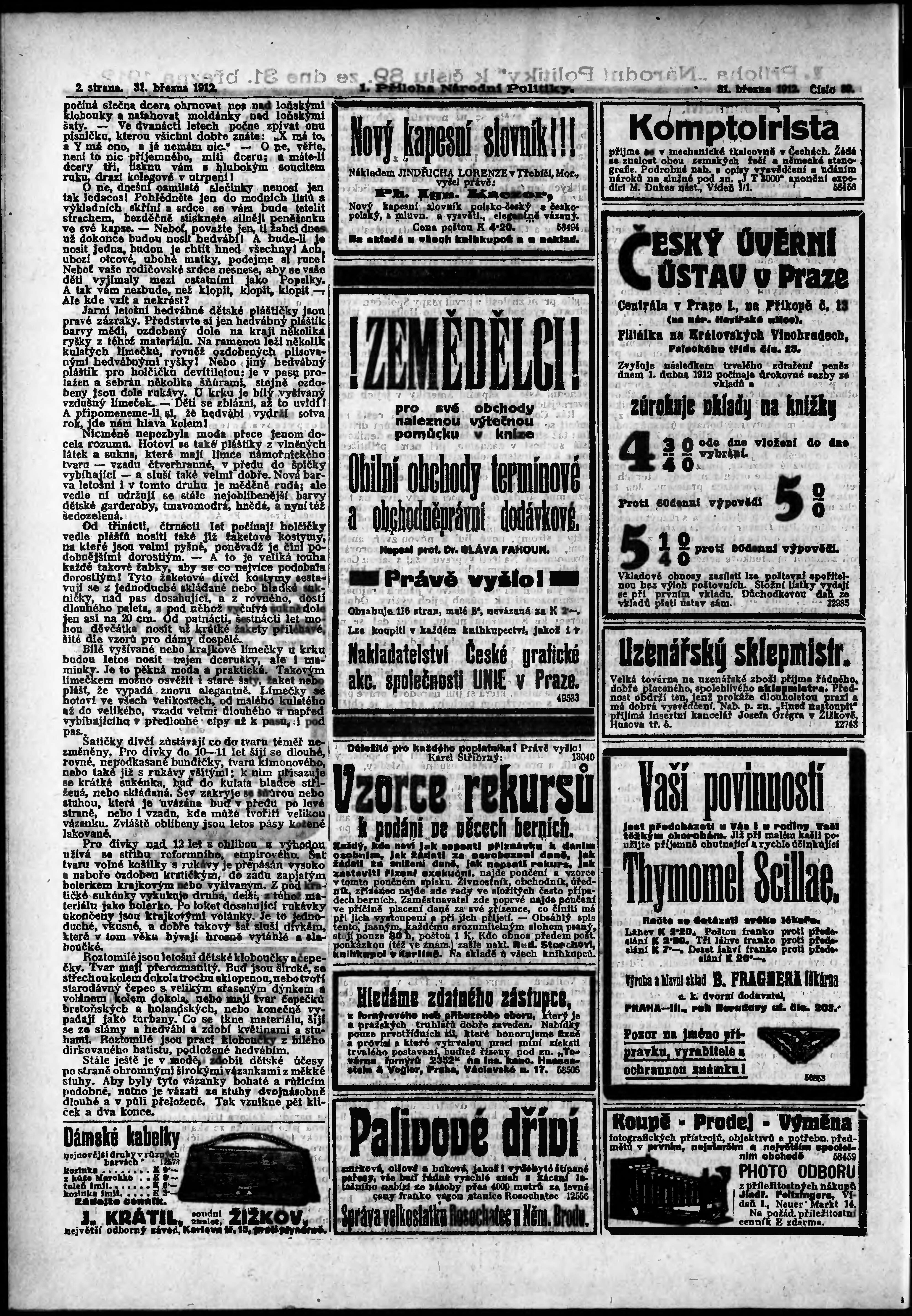 * Datum vydání výtisku: 31.3.1912 Číslo výtisku: 89 Typ výtisku: příloha Poznámky k výtisku: 1. příloha;