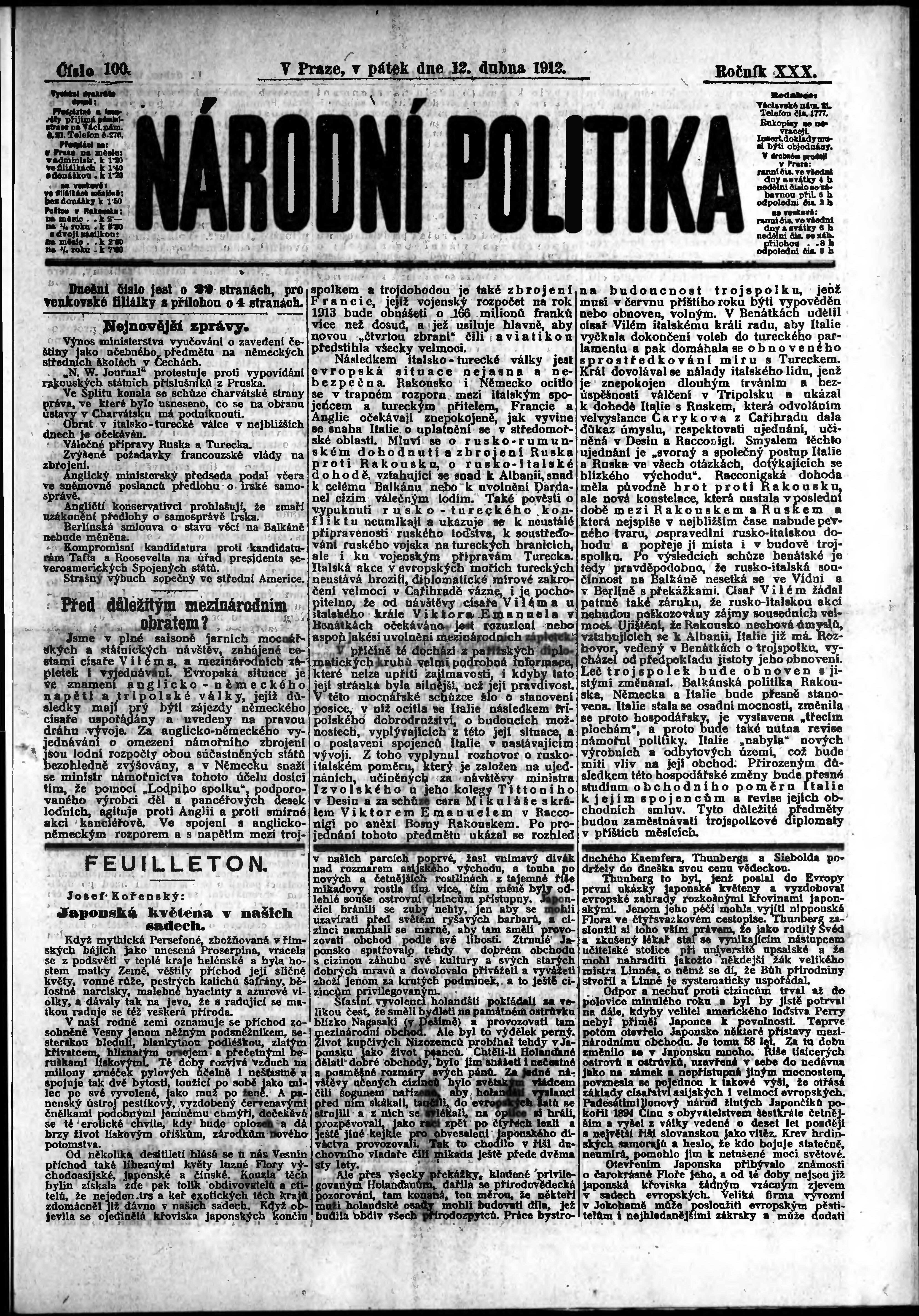 * Datum vydání výtisku: 12.4.1912 Číslo výtisku: 100 Poznámky k výtisku: ranní vydání; s. 13 - 14 není k dispozici;
