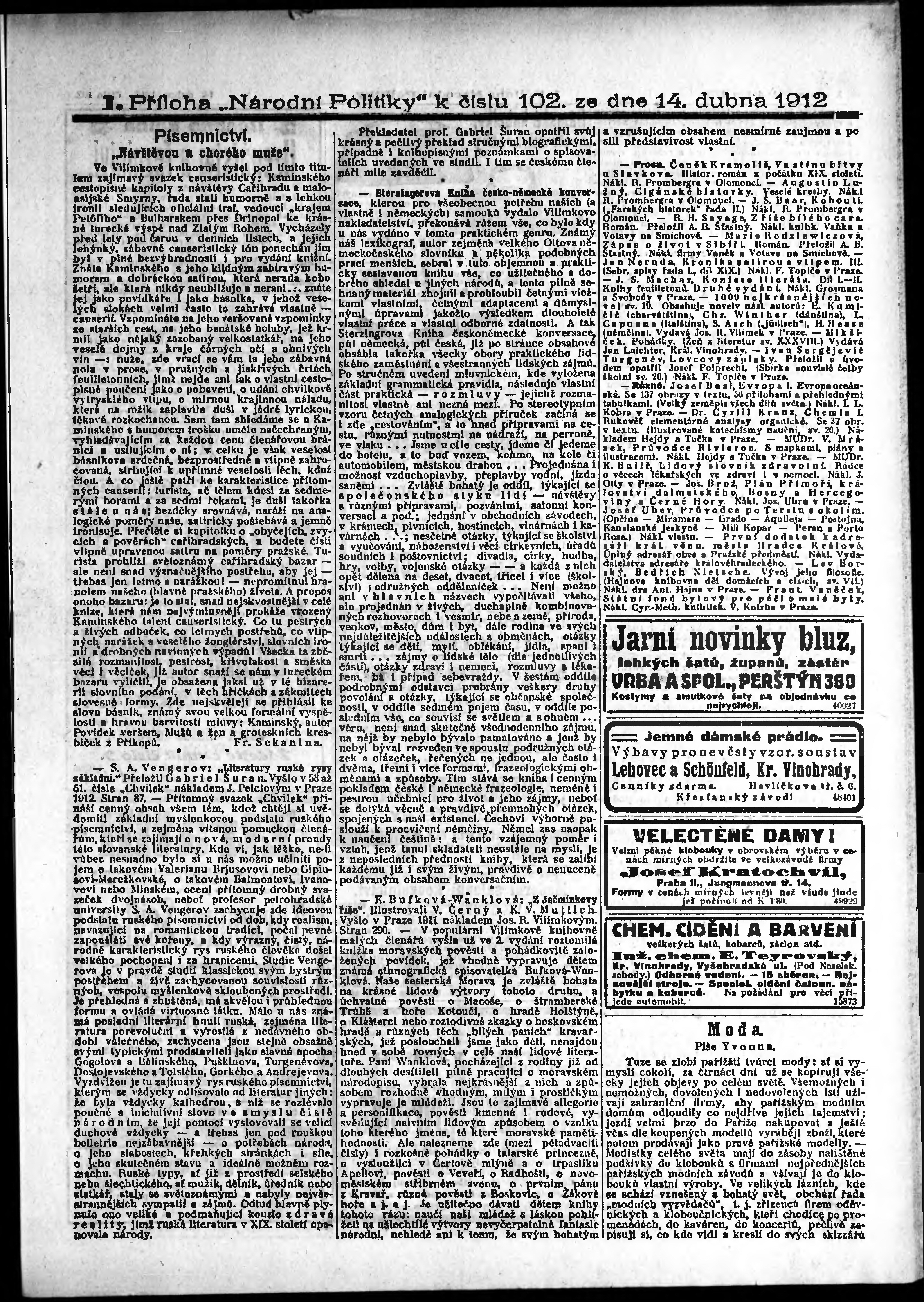 * Datum vydání výtisku: 14.4.1912 Číslo výtisku: 102 Typ výtisku: příloha Poznámky k výtisku: 1. příloha; s. 9 - 10 není k dispozici;