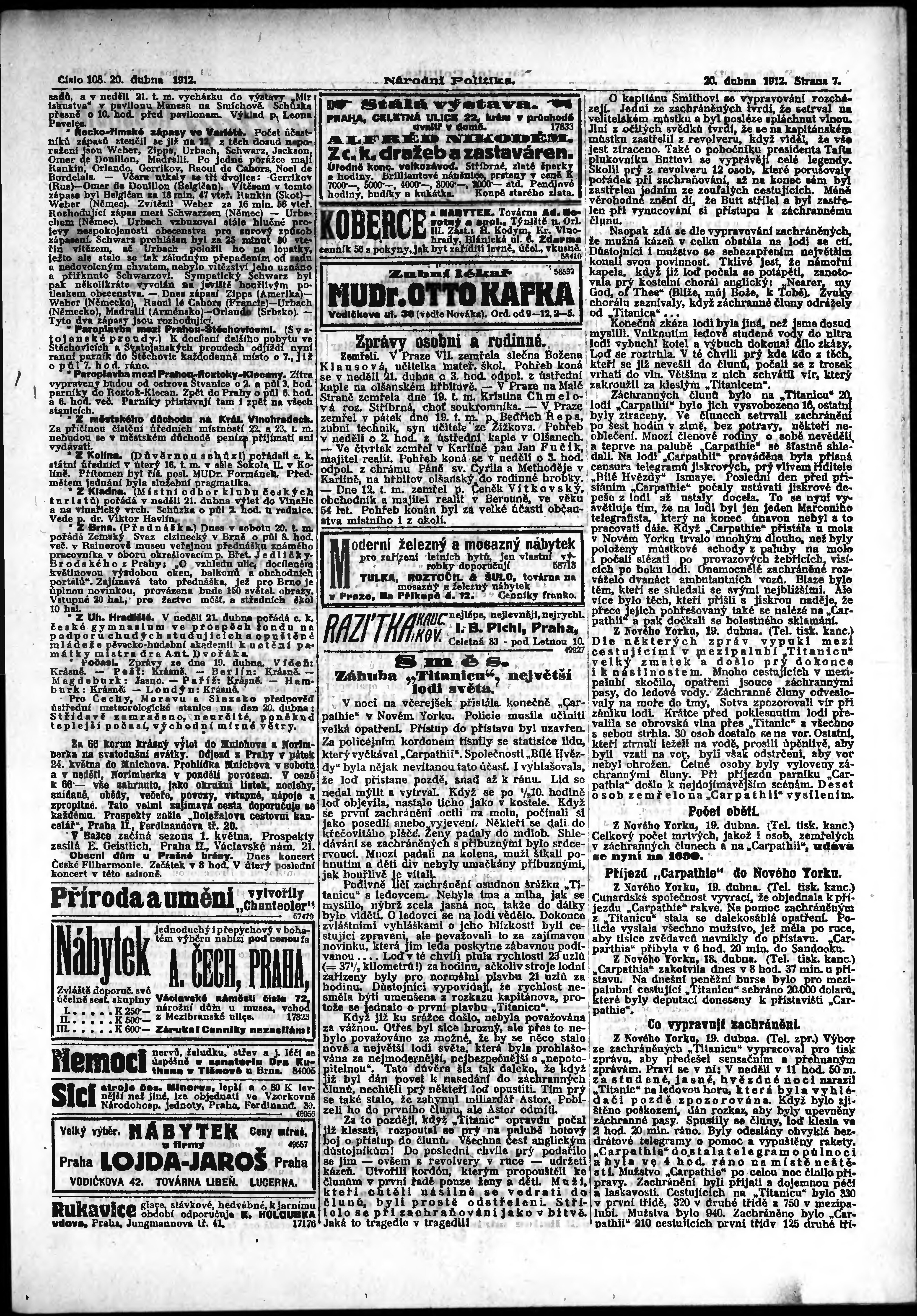* Datum vydání výtisku: 20.4.1912 Číslo výtisku: 108 Poznámky k výtisku: ranní vydání;