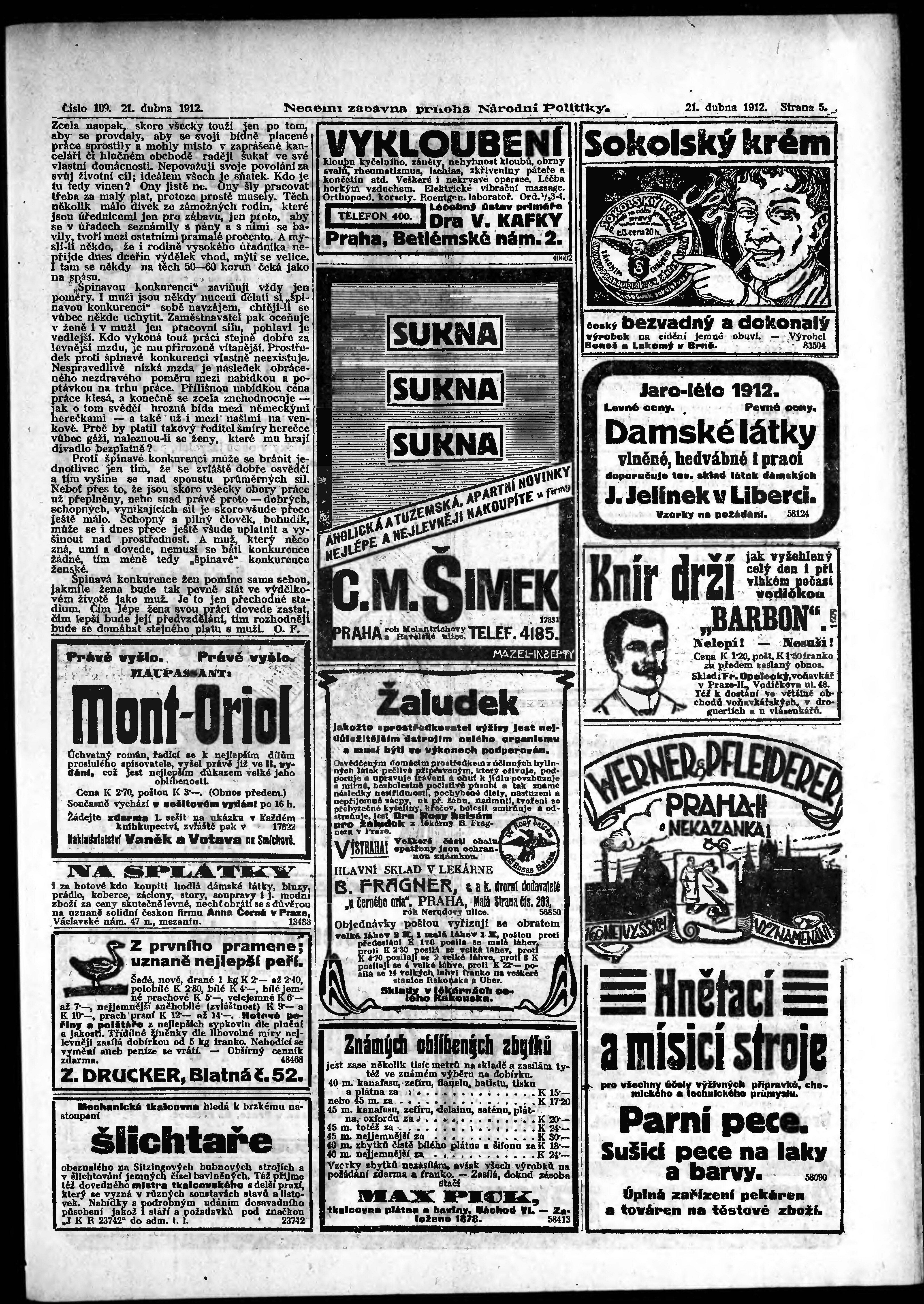 * Datum vydání výtisku: 21.4.1912 Číslo výtisku: 109 Typ výtisku: příloha