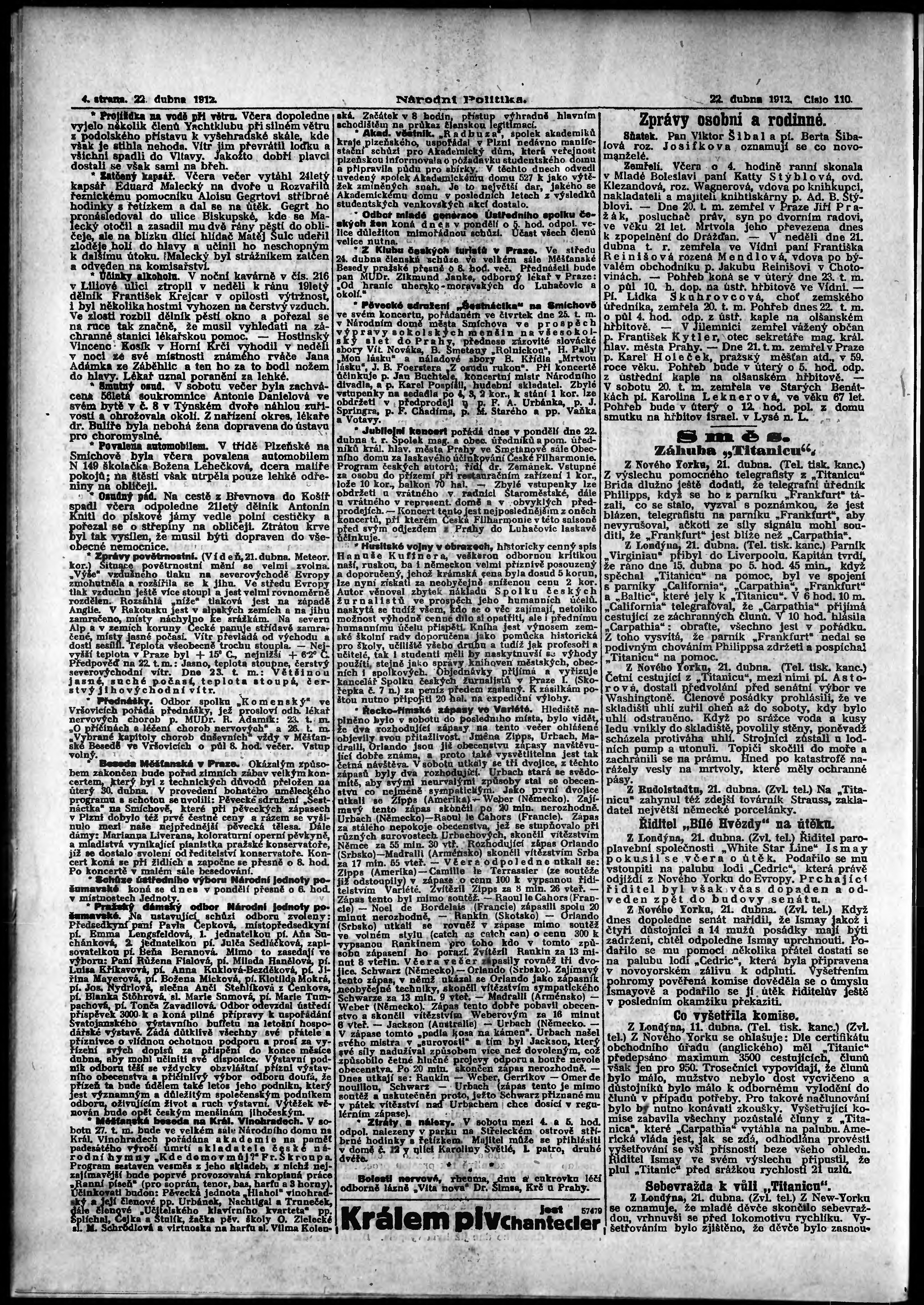 * Datum vydání výtisku: 22.4.1912 Číslo výtisku: 110 Poznámky k výtisku: ranní vydání;