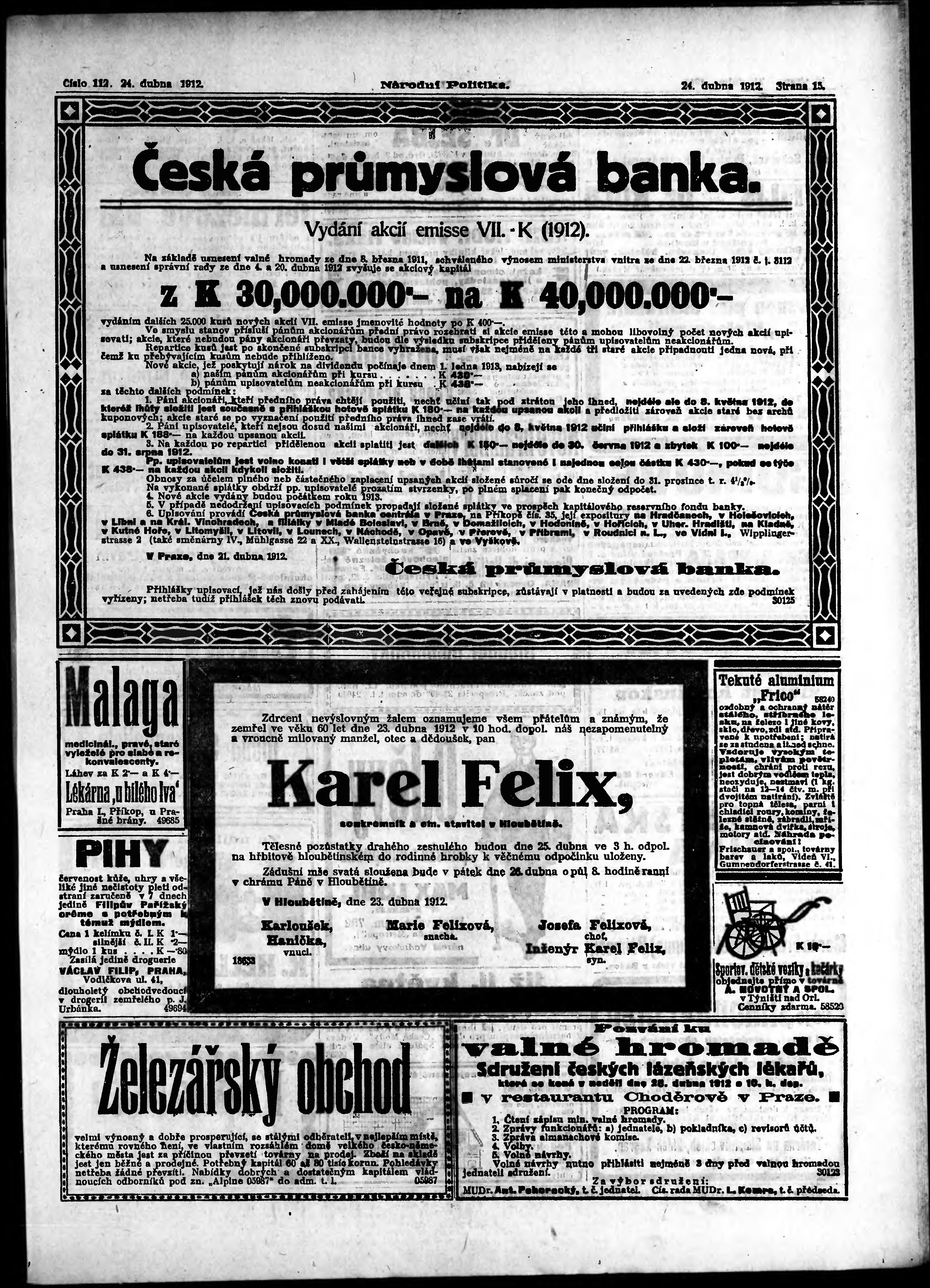 * Datum vydání výtisku: 24.4.1912 Číslo výtisku: 112 Poznámky k výtisku: ranní vydání;