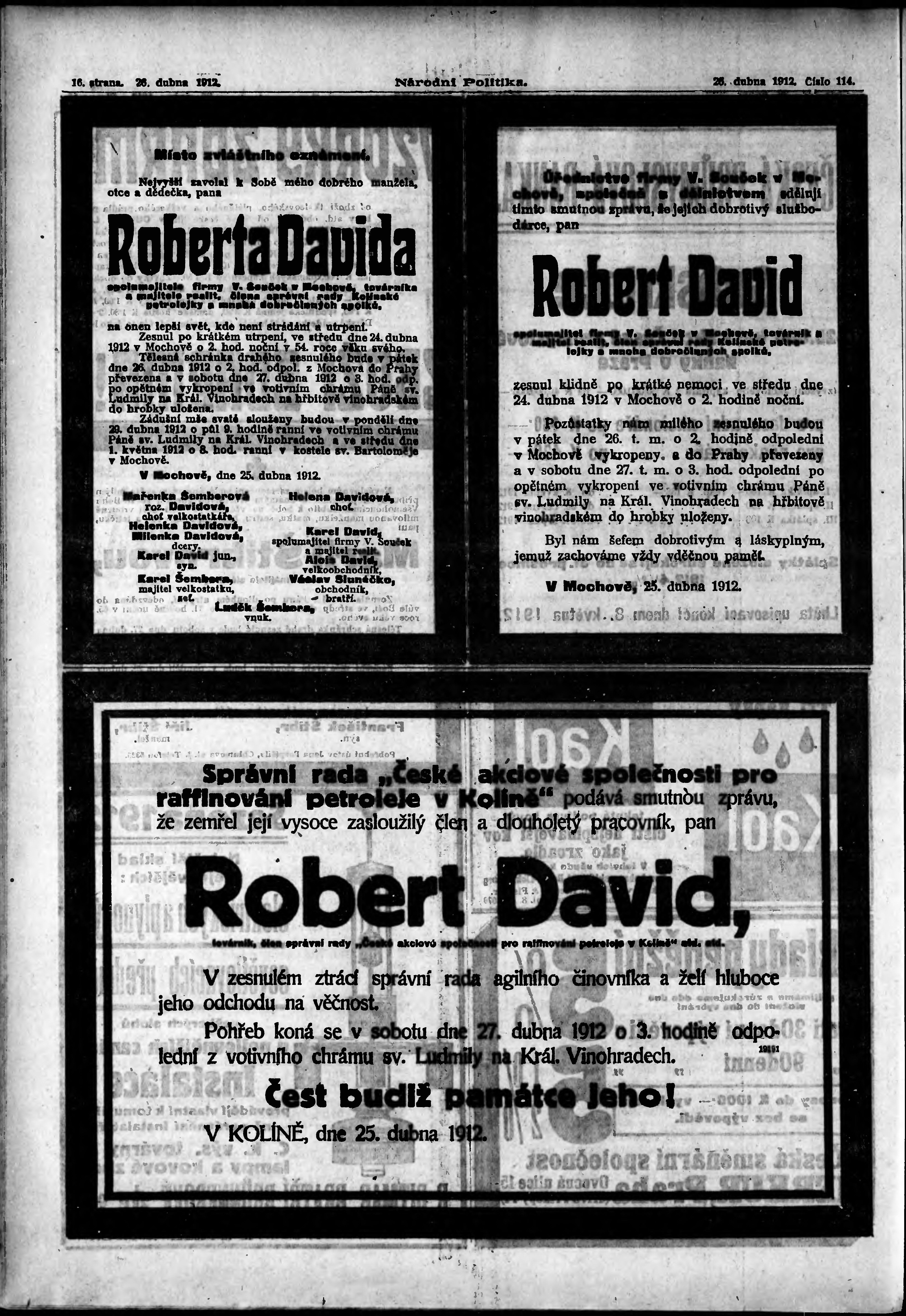 * Datum vydání výtisku: 26.4.1912 Číslo výtisku: 114 Poznámky k výtisku: ranní vydání;