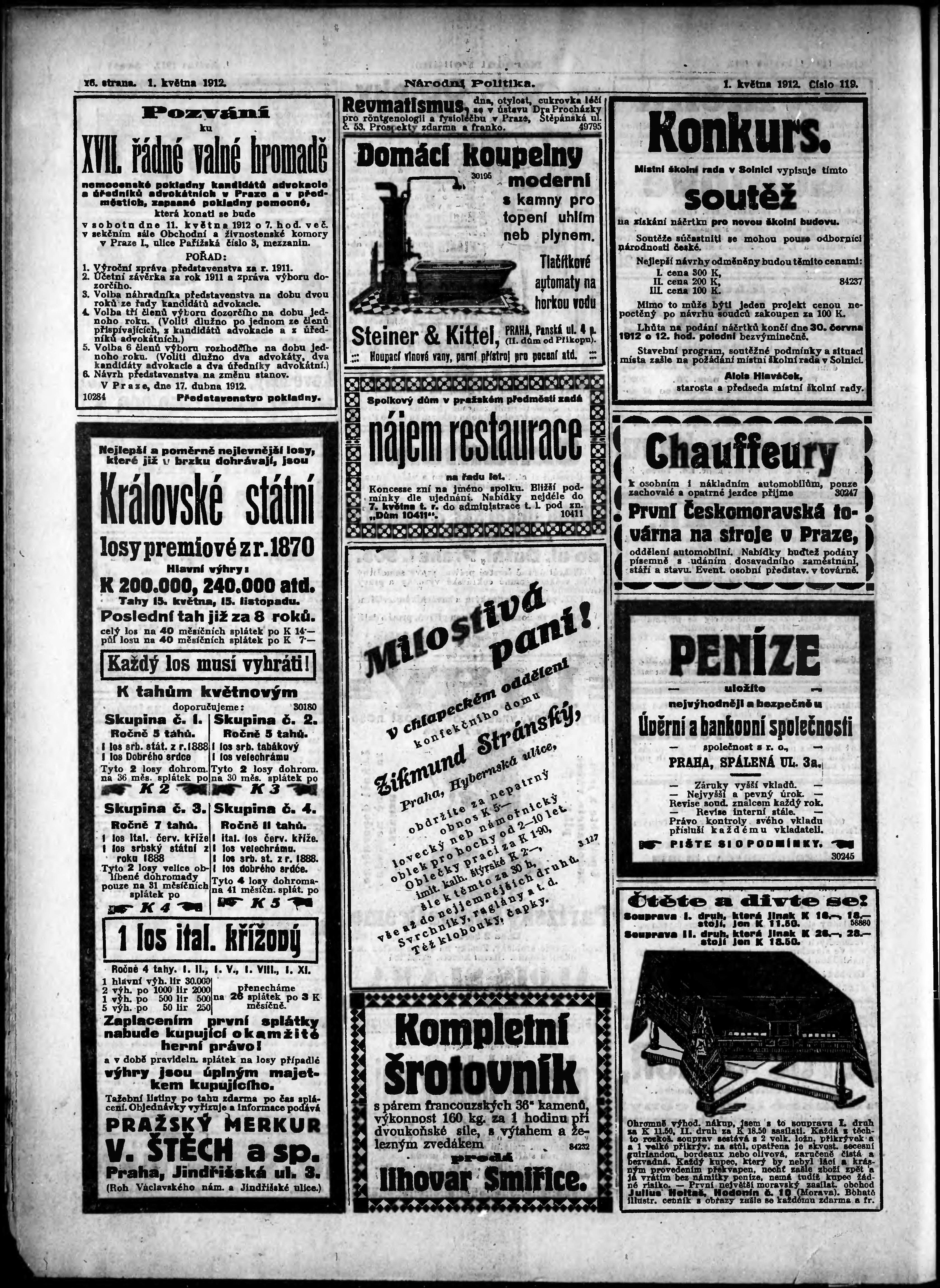 * Datum vydání výtisku: 1.5.1912 Číslo výtisku: 119 Poznámky k výtisku: ranní vydání;