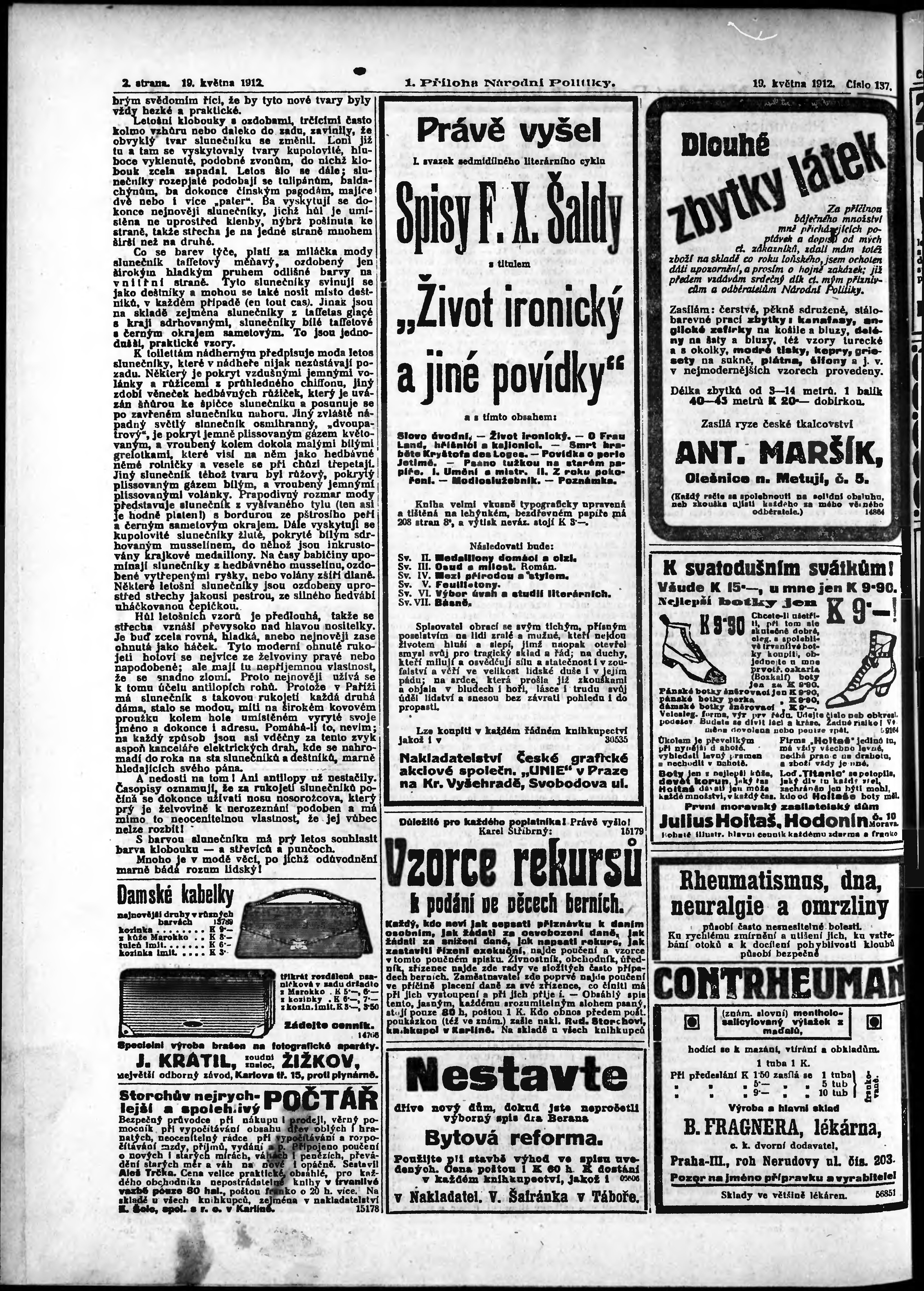 * Datum vydání výtisku: 19.5.1912 Číslo výtisku: 137 Typ výtisku: příloha Poznámky k výtisku: 1. příloha;
