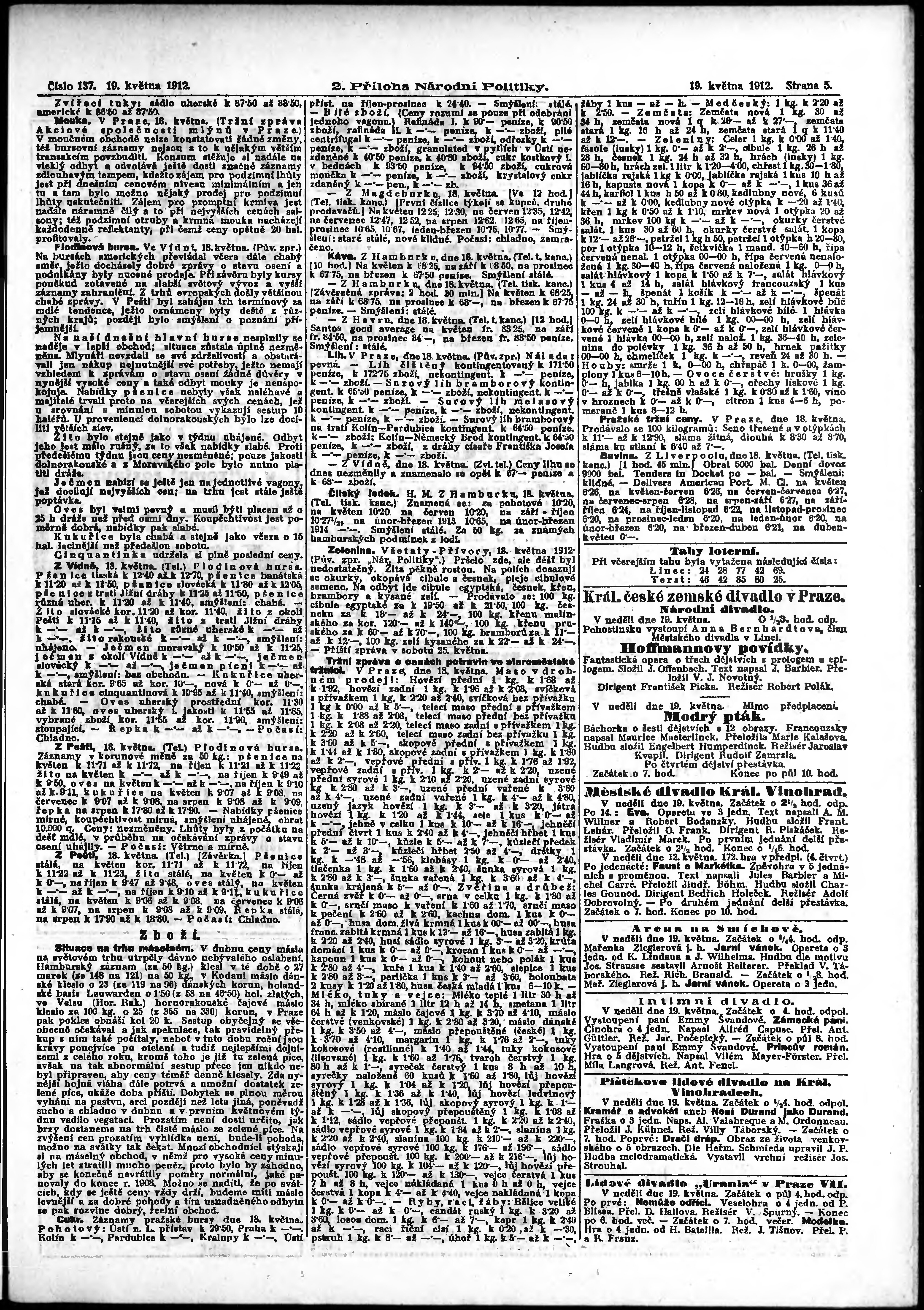 * Datum vydání výtisku: 19.5.1912 Číslo výtisku: 137 Typ výtisku: příloha Poznámky k výtisku: 2. příloha; obsahuje č. 20 Herold českoslovanského peněžnictví;