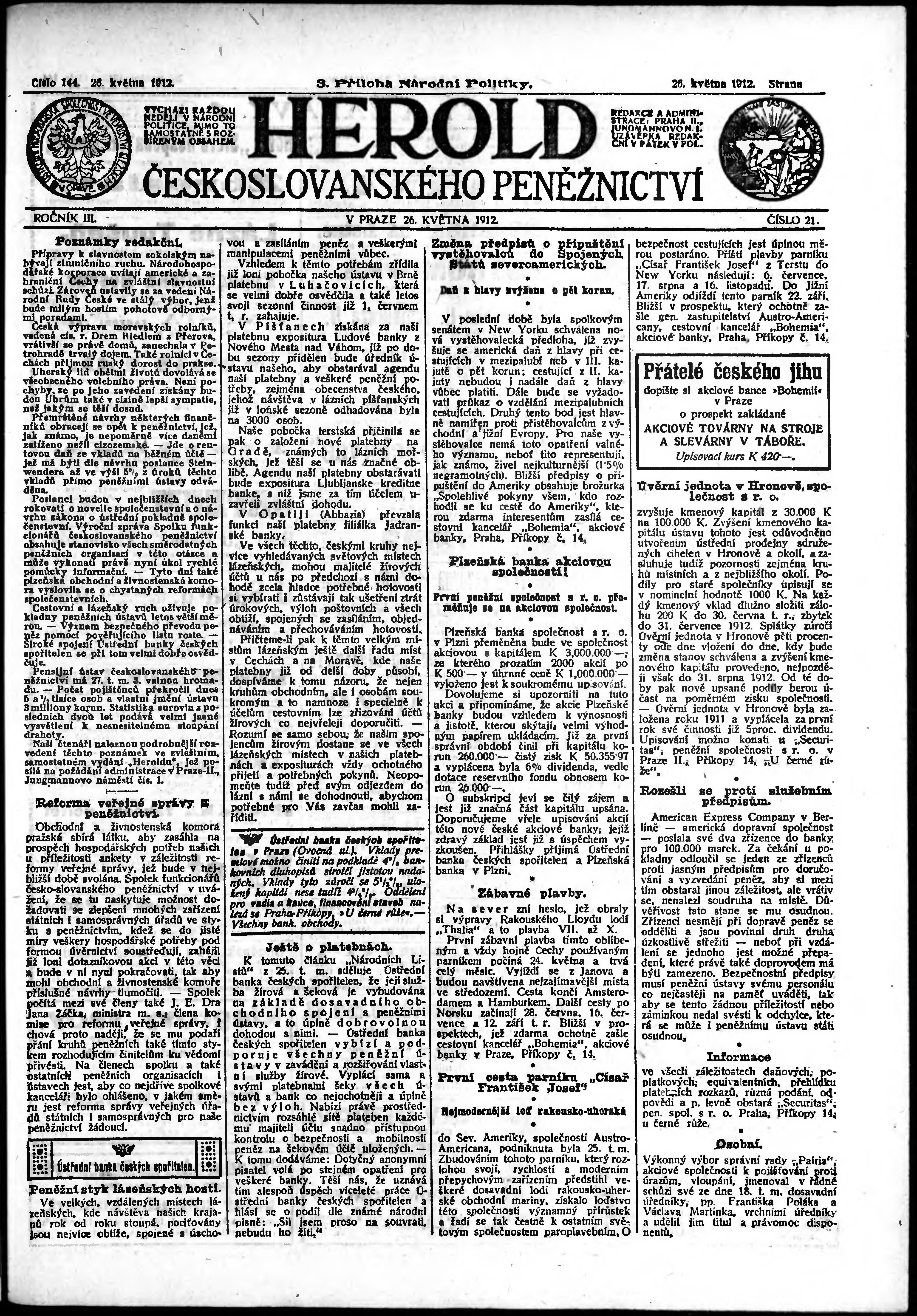 Poznámky k výtisku: 3. příloha; obsahuje č. 21 Herold českoslovanského peněžnictví;