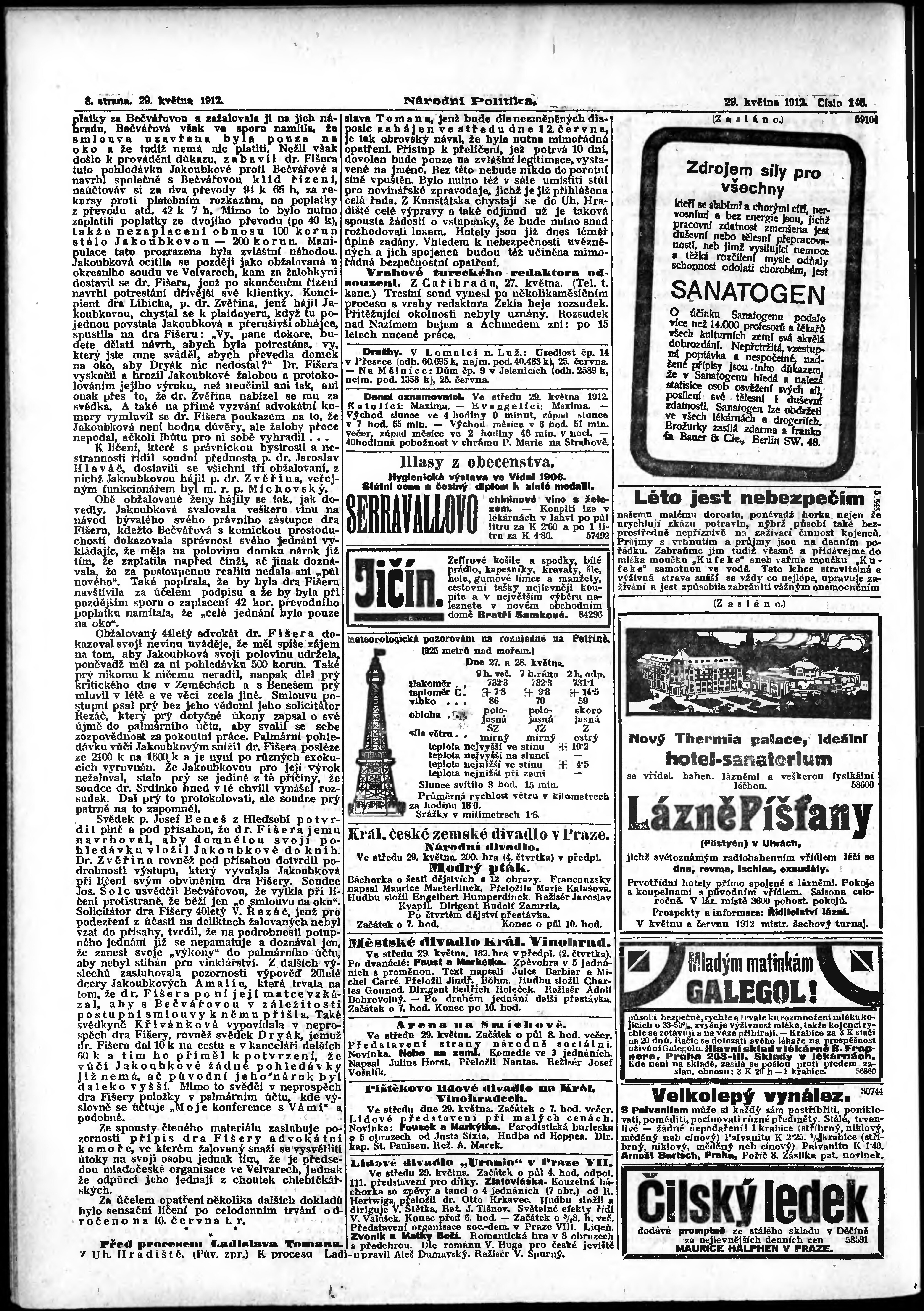 * Datum vydání výtisku: 29.5.1912 Číslo výtisku: 146 Poznámky k výtisku: ranní vydání;