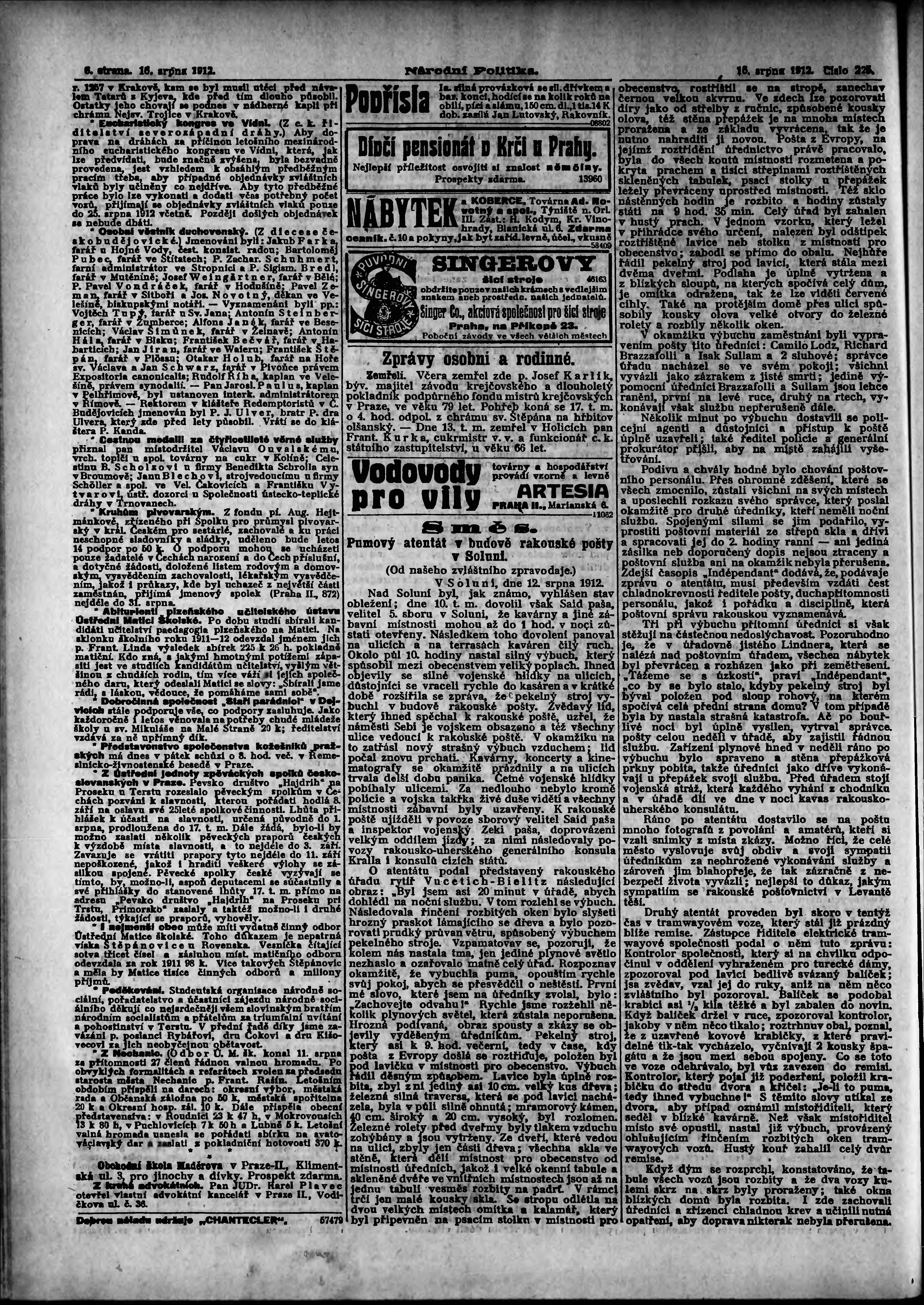 * Datum vydání výtisku: 16.8.1912 Číslo výtisku: 225 Poznámky k výtisku: ranní vydání;
