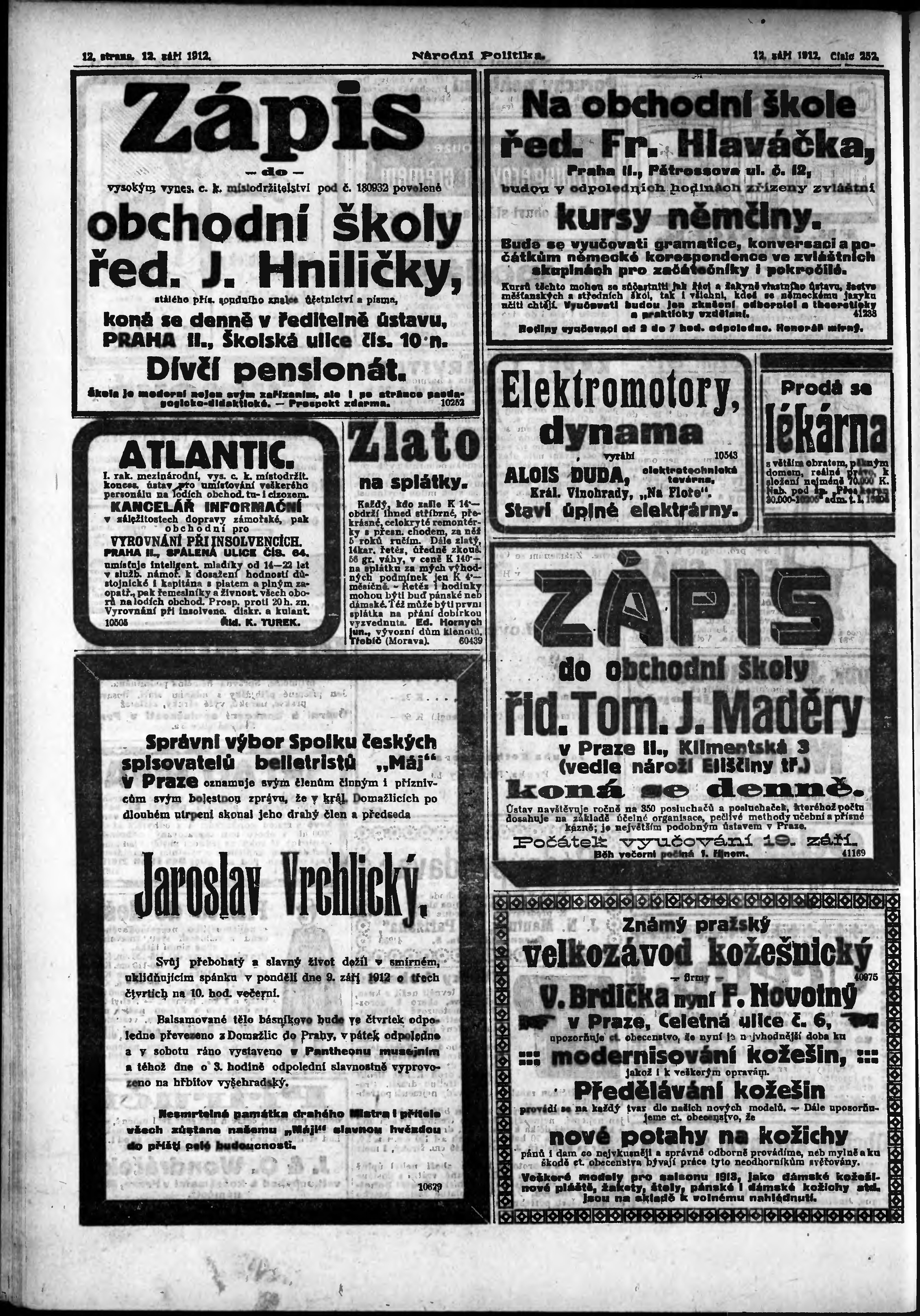 * Datum vydání výtisku: 12.9.1912 Číslo výtisku: 252 Poznámky k výtisku: ranní vydání;