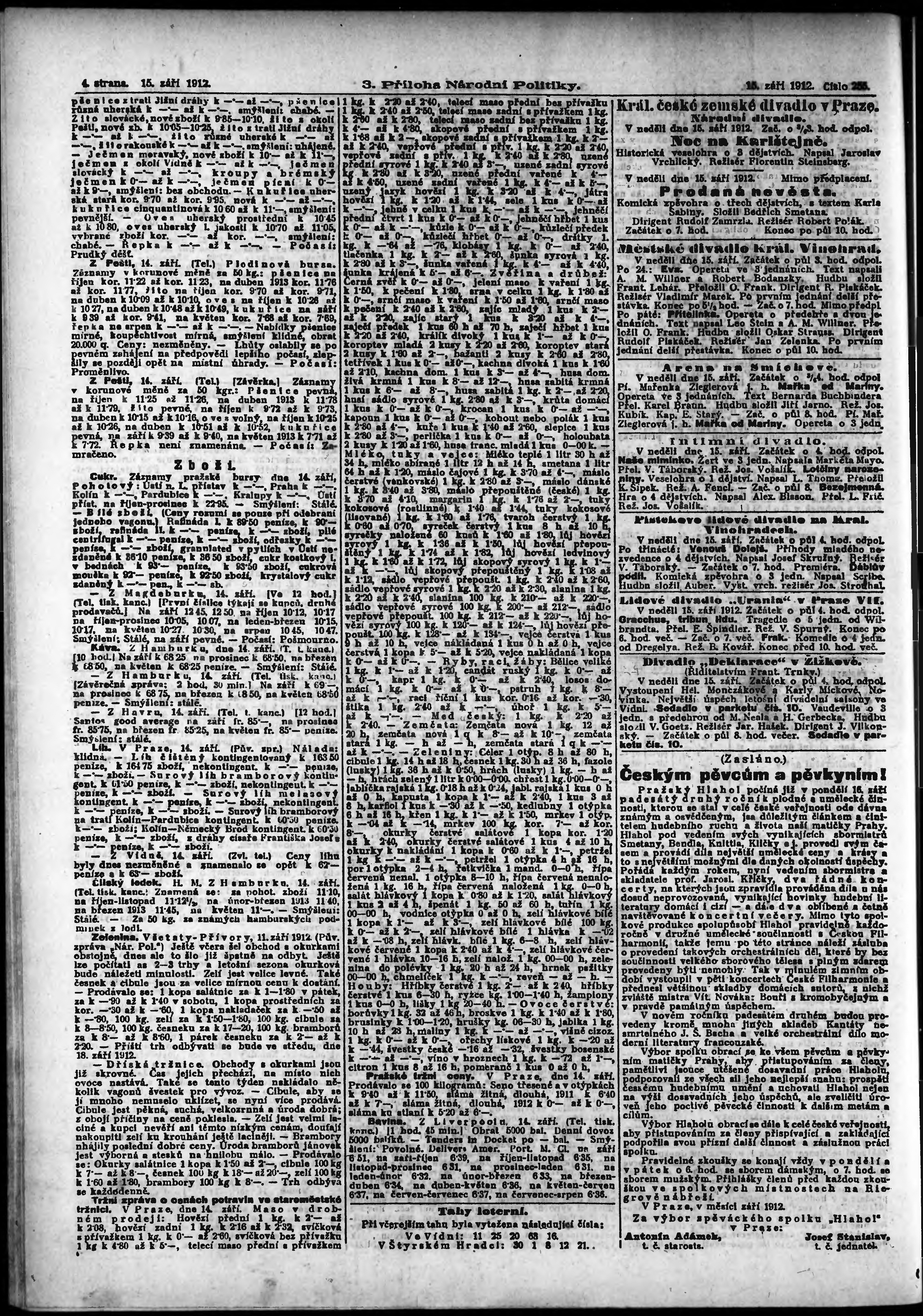 * Datum vydání výtisku: 15.9.1912 Číslo výtisku: 255 Typ výtisku: příloha Poznámky k výtisku: 3. příloha; obsahuje č. 37 Herold českoslovanského peněžnictví;