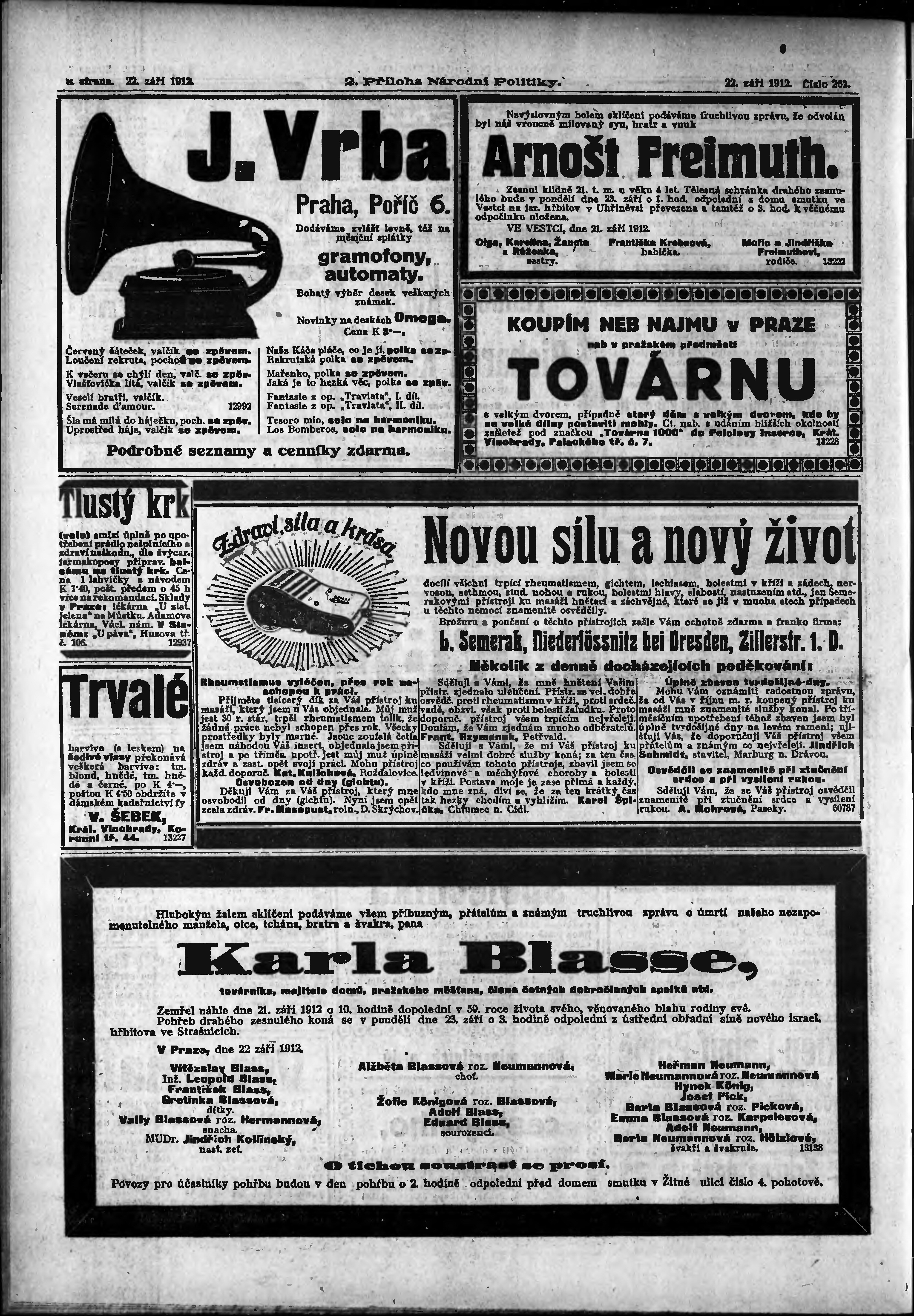 * Datum vydání výtisku: 22.9.1912 Číslo výtisku: 262 Typ výtisku: příloha Poznámky k výtisku: 2. příloha; obsahuje č. 38 Herold českoslovanského peněžnictví;