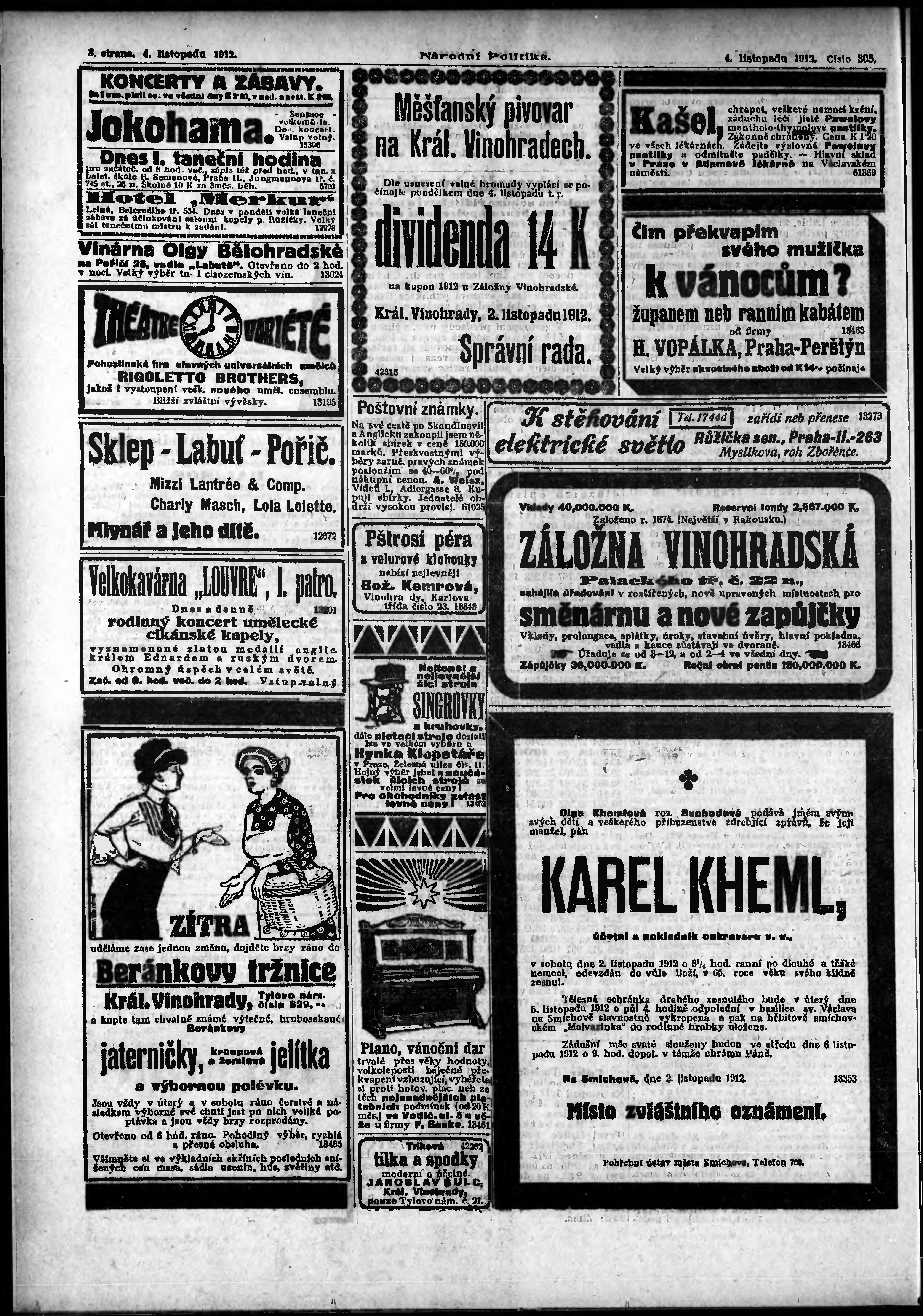 * Datum vydání výtisku: 4.11.1912 Číslo výtisku: 305 Poznámky k výtisku: ranní vydání;
