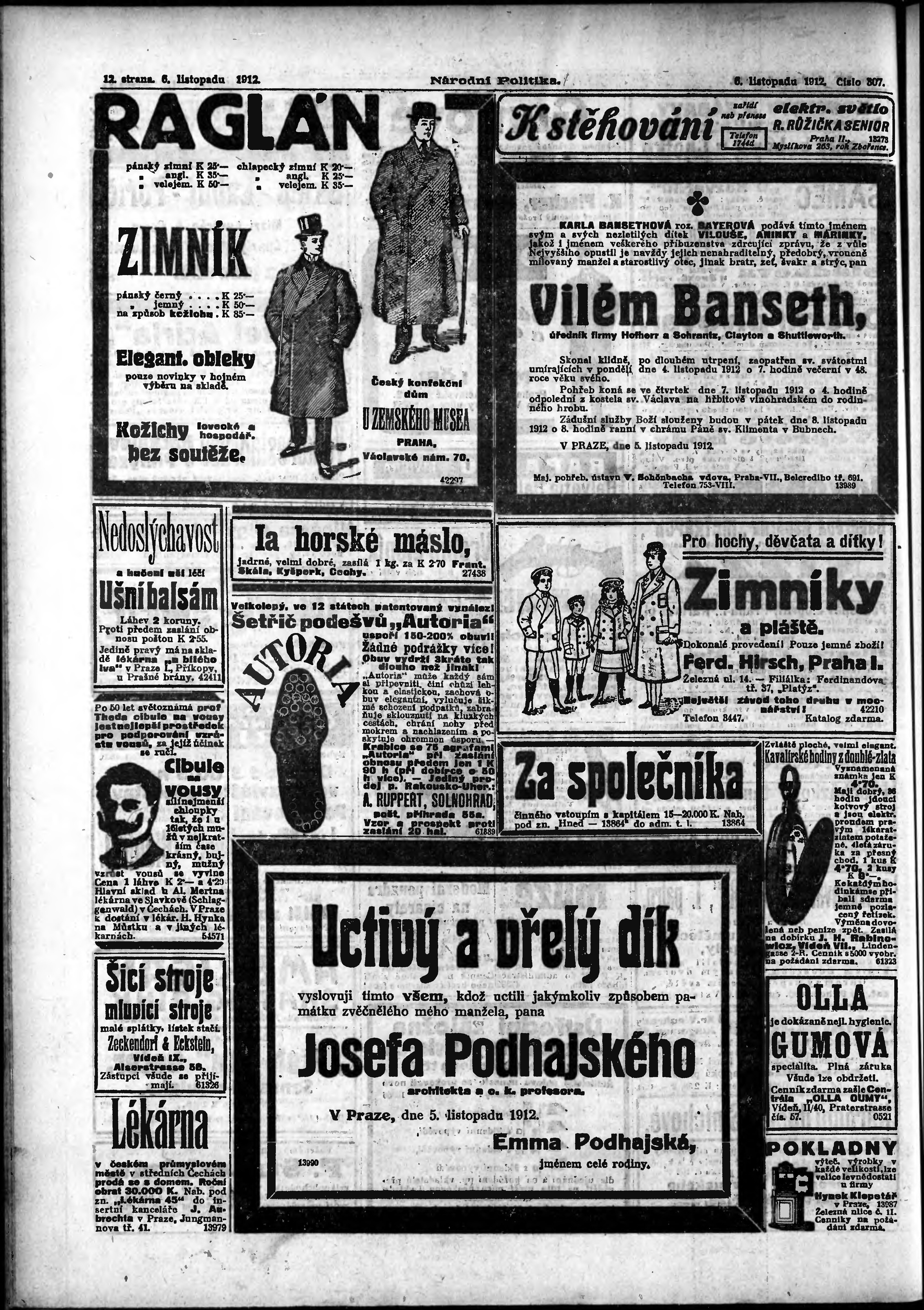* Datum vydání výtisku: 6.11.1912 Číslo výtisku: 307 Poznámky k výtisku: ranní vydání;
