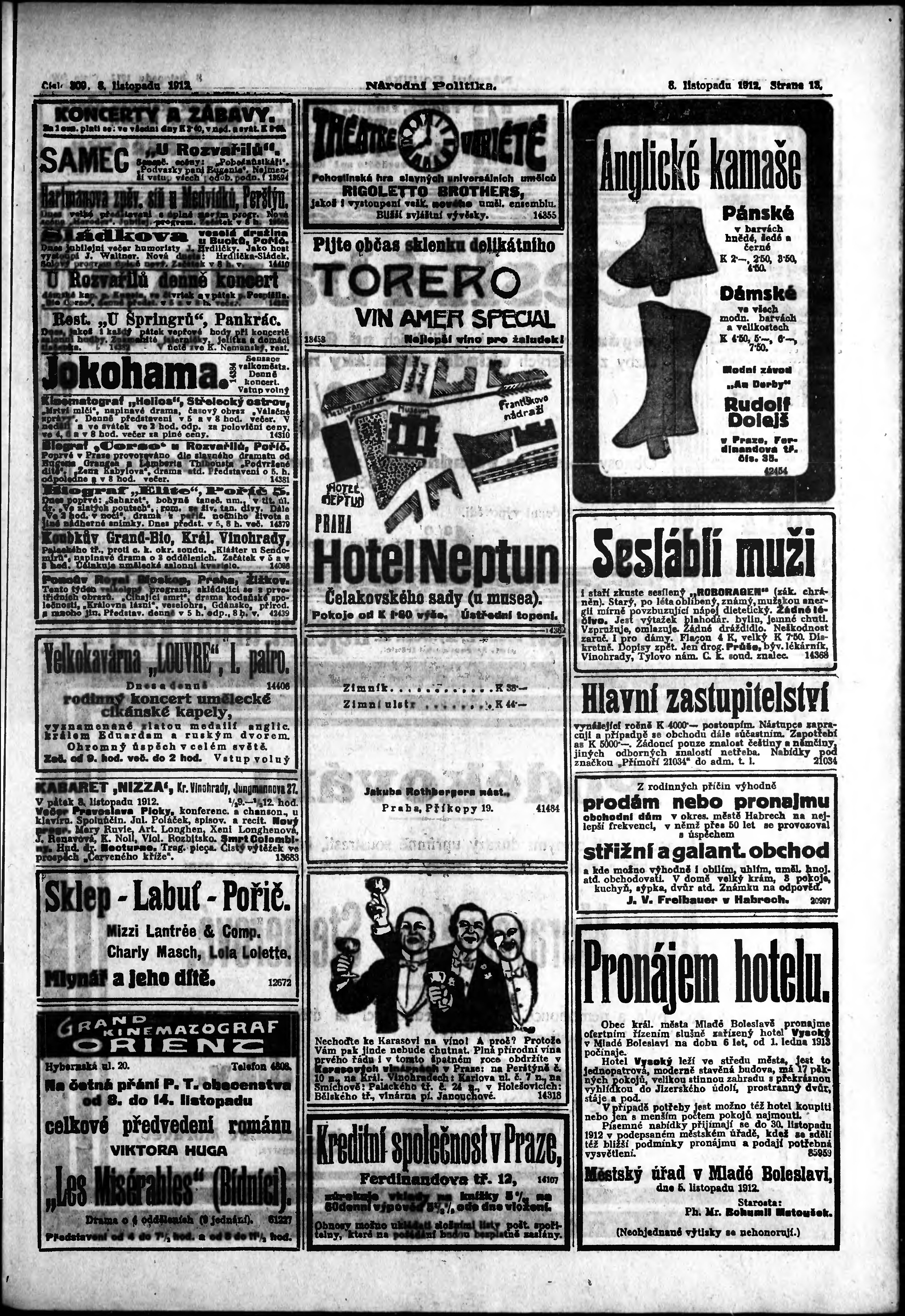 * Datum vydání výtisku: 8.11.1912 Číslo výtisku: 309 Poznámky k výtisku: ranní vydání;