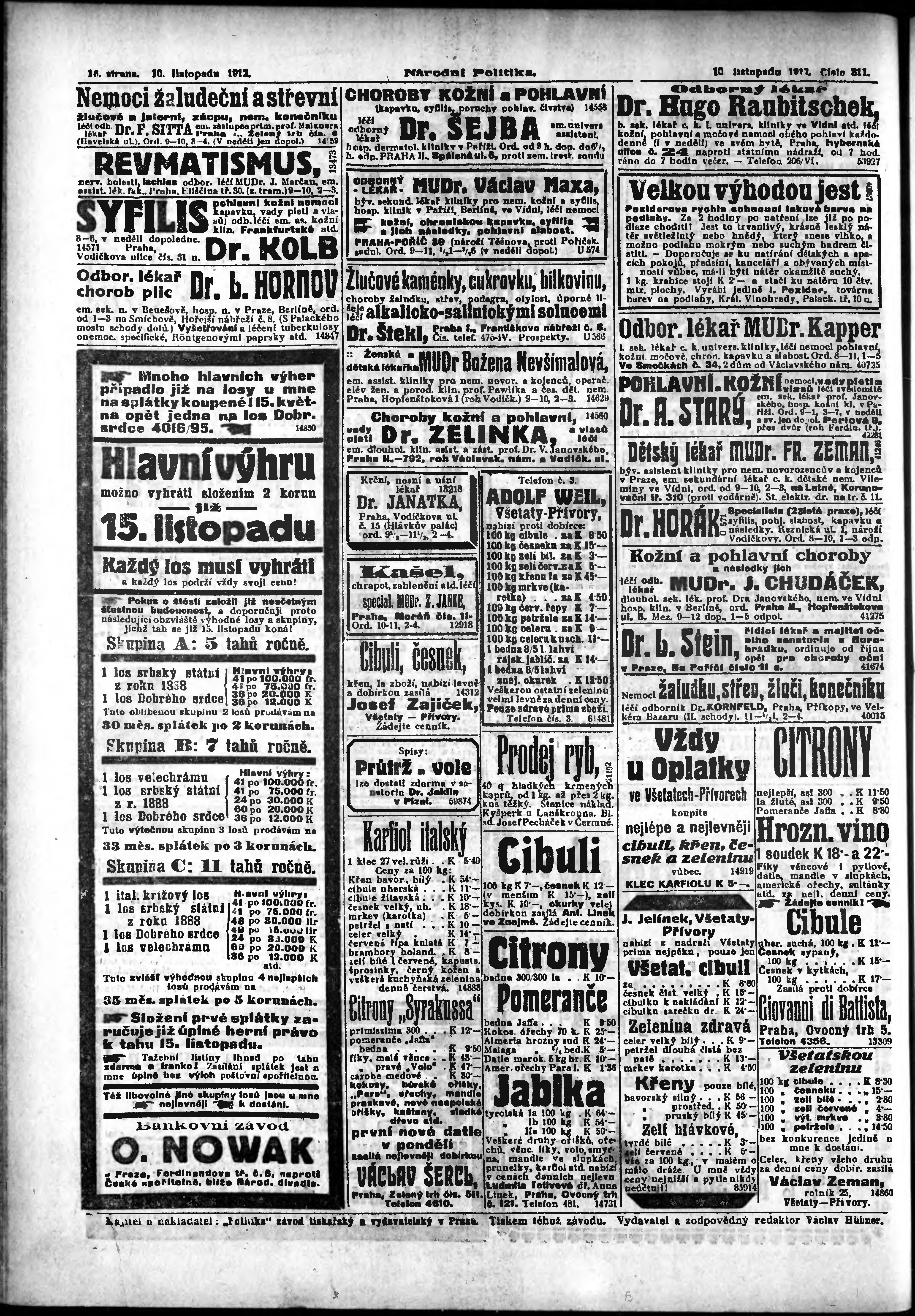 * Datum vydání výtisku: 10.11.1912 Číslo výtisku: 311 Poznámky k výtisku: ranní vydání;