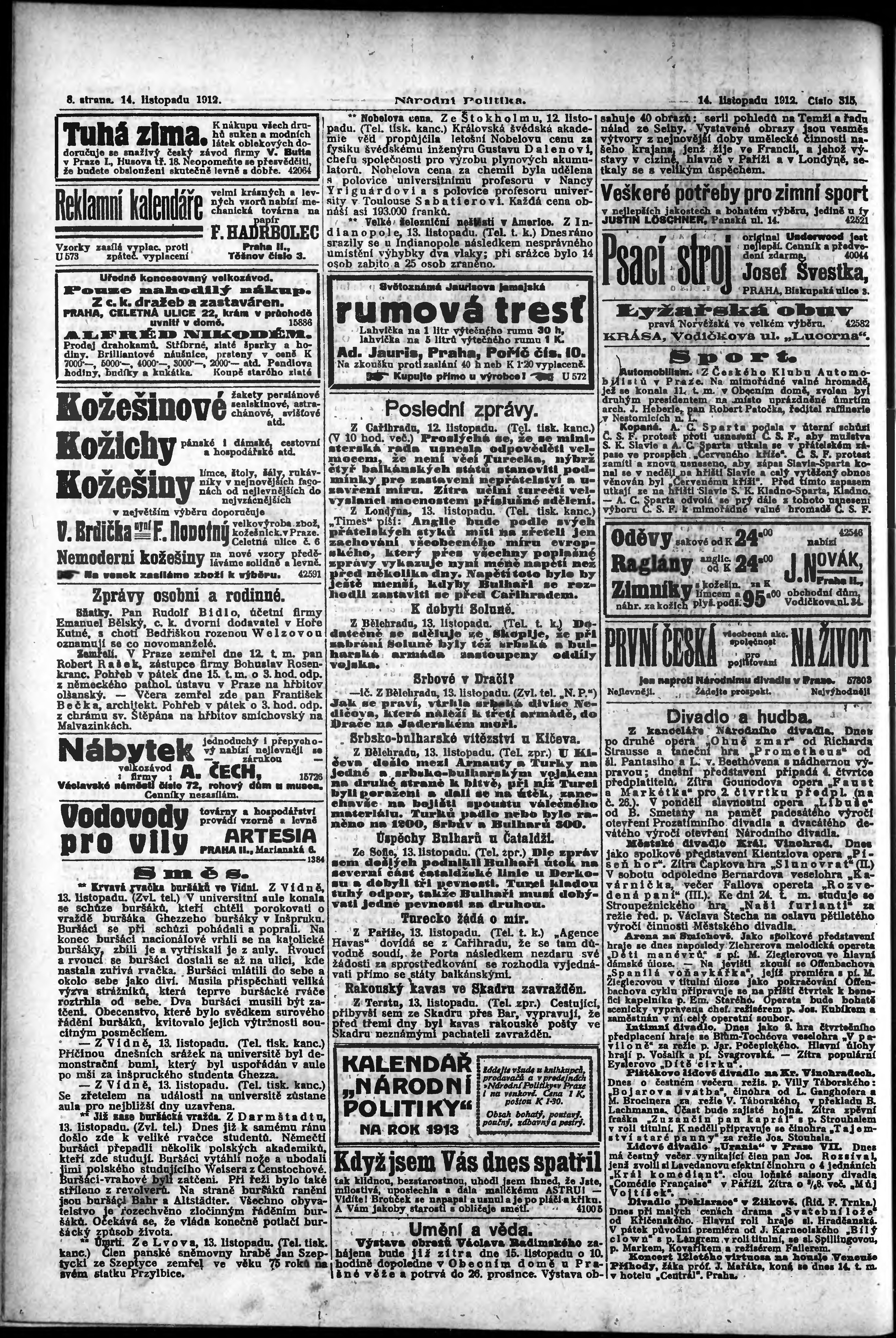 * Datum vydání výtisku: 14.11.1912 Číslo výtisku: 315 Poznámky k výtisku: ranní vydání;