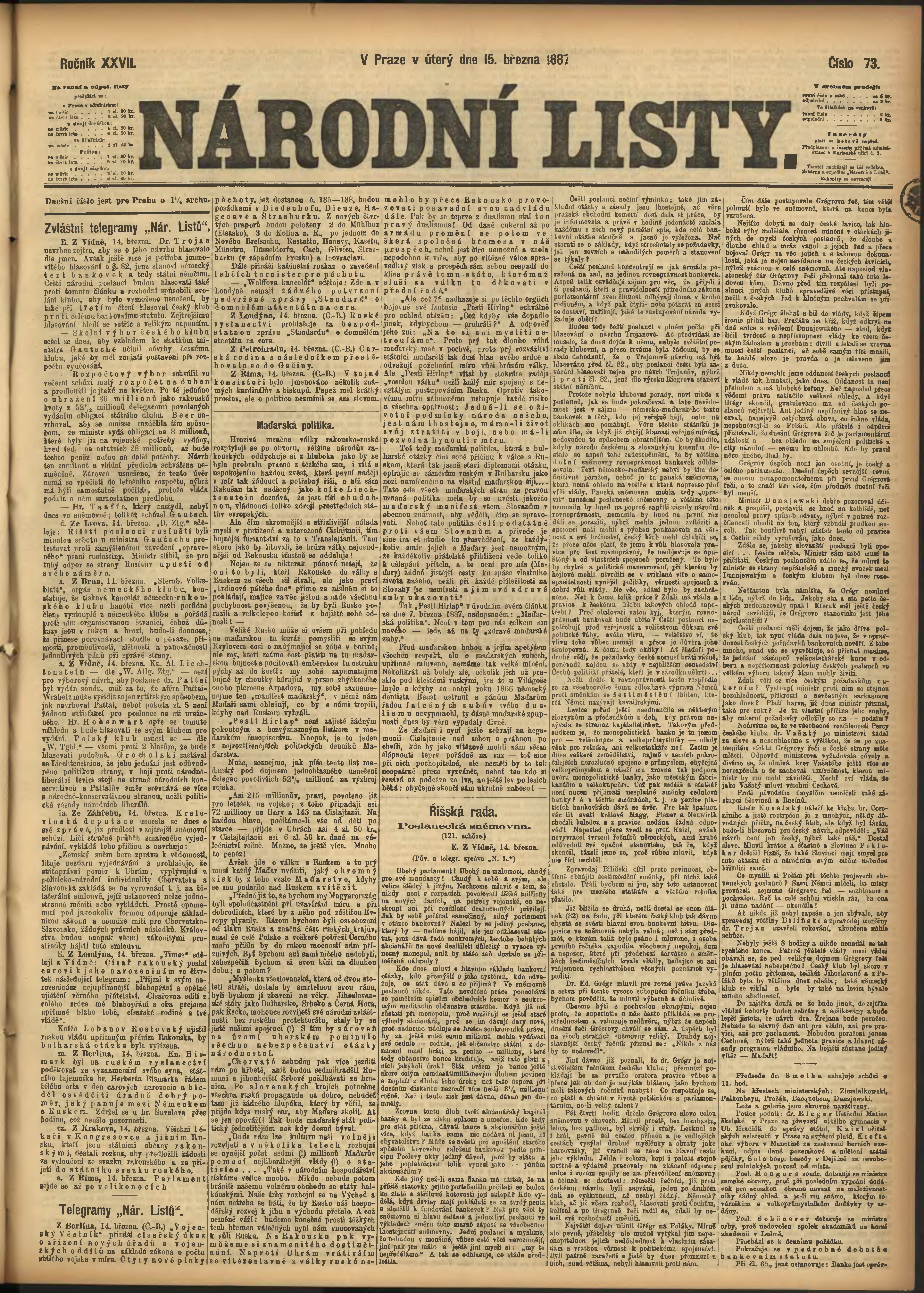 * Datum vydání výtisku: 15.3.1887 Číslo výtisku: 73