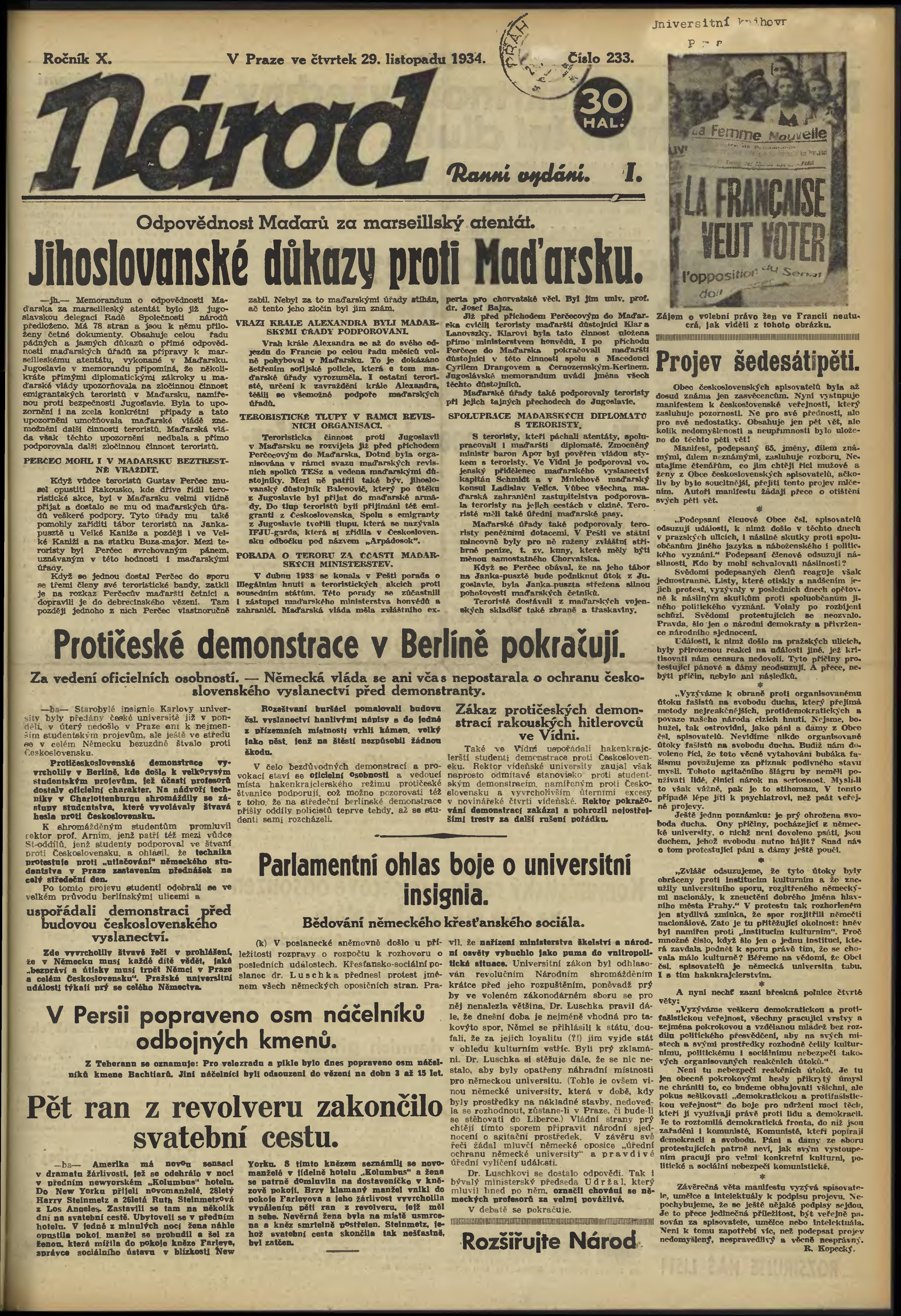 * Datum vydání výtisku: 29.11.1934 Číslo výtisku: 233 Poznámky k výtisku: ranní vydání; 1. vydání;