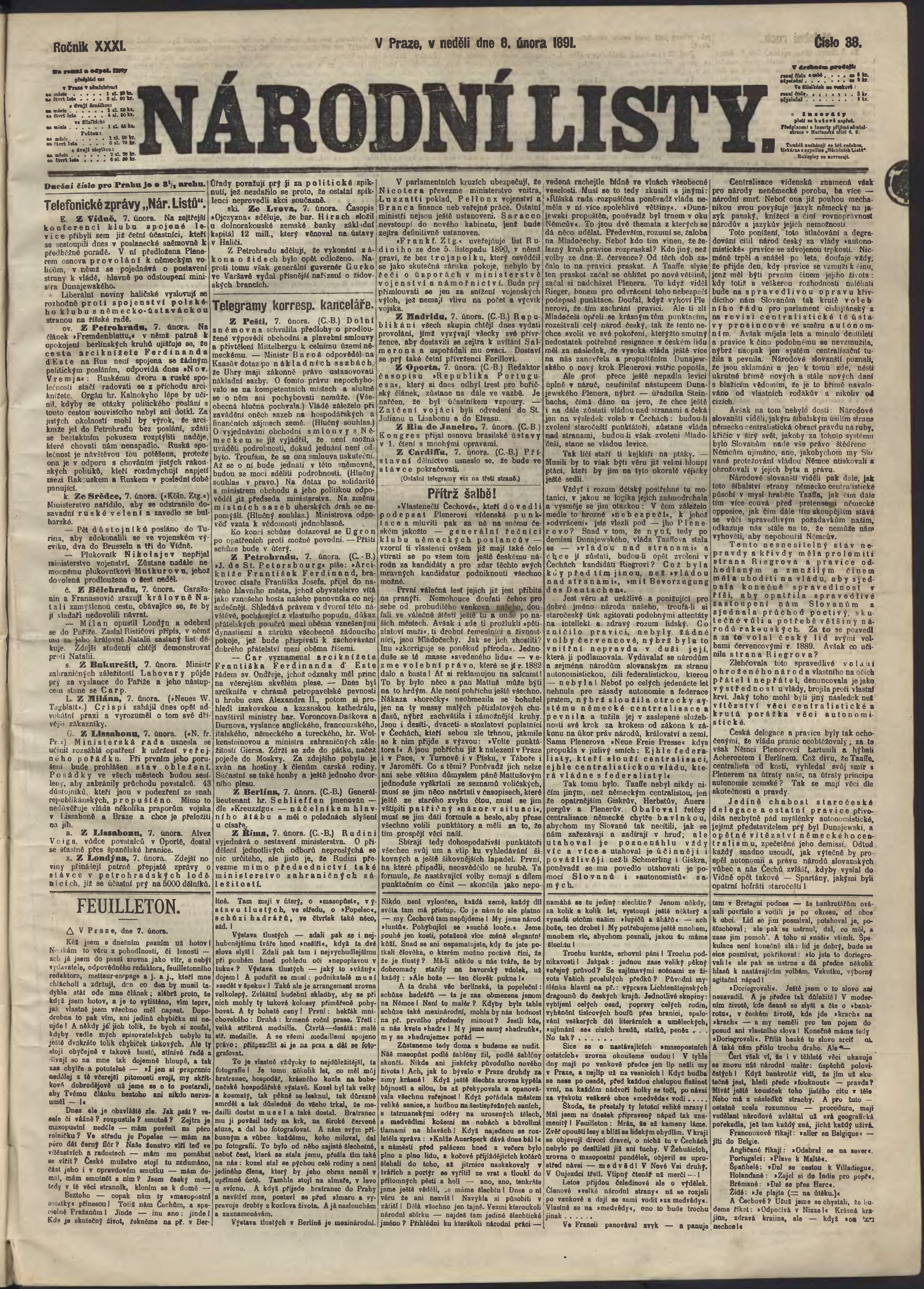 * Datum vydání výtisku: 8.2.1891 Číslo výtisku: 38
