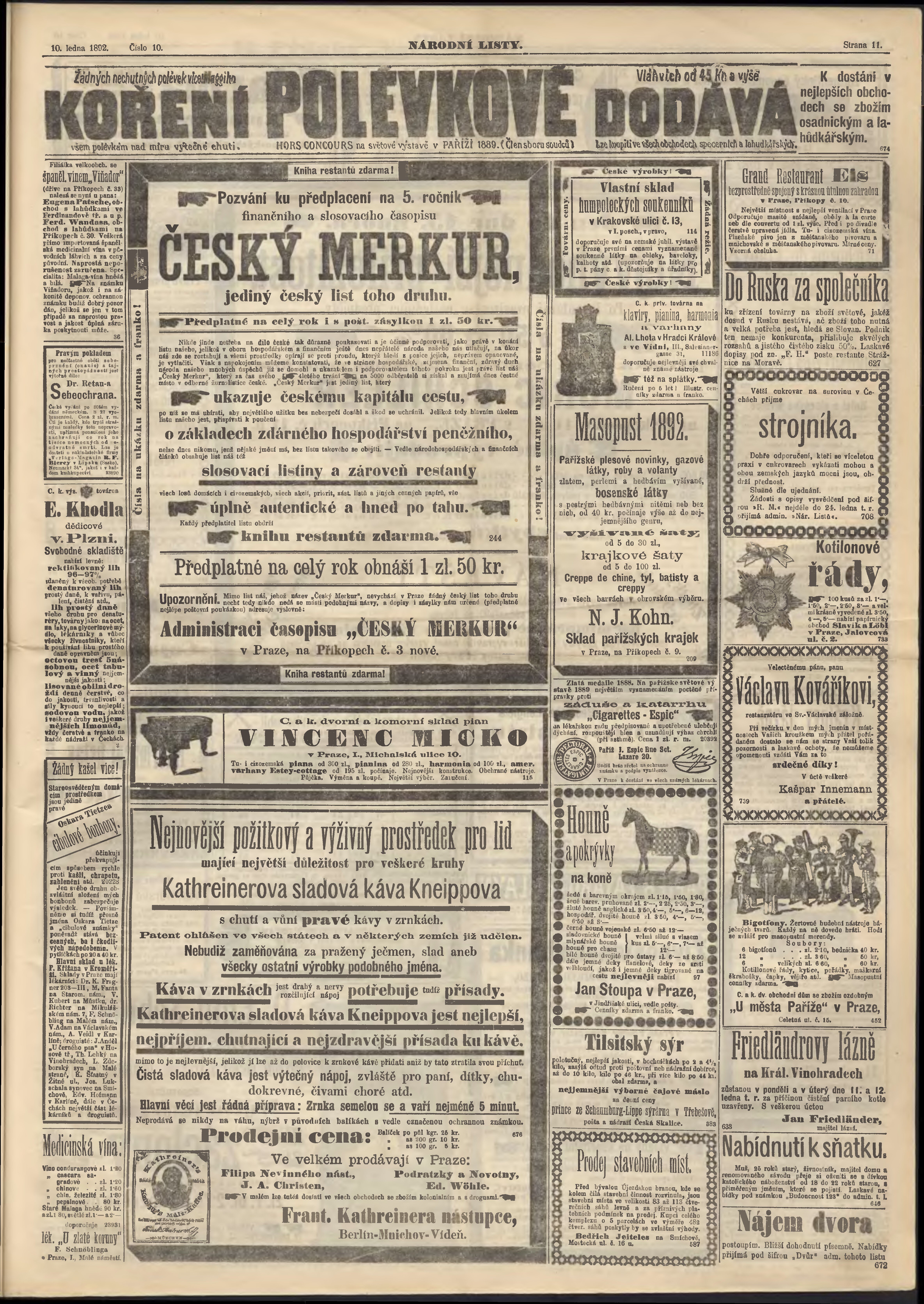 * Datum vydání výtisku: 10.1.1892 Číslo výtisku: 10