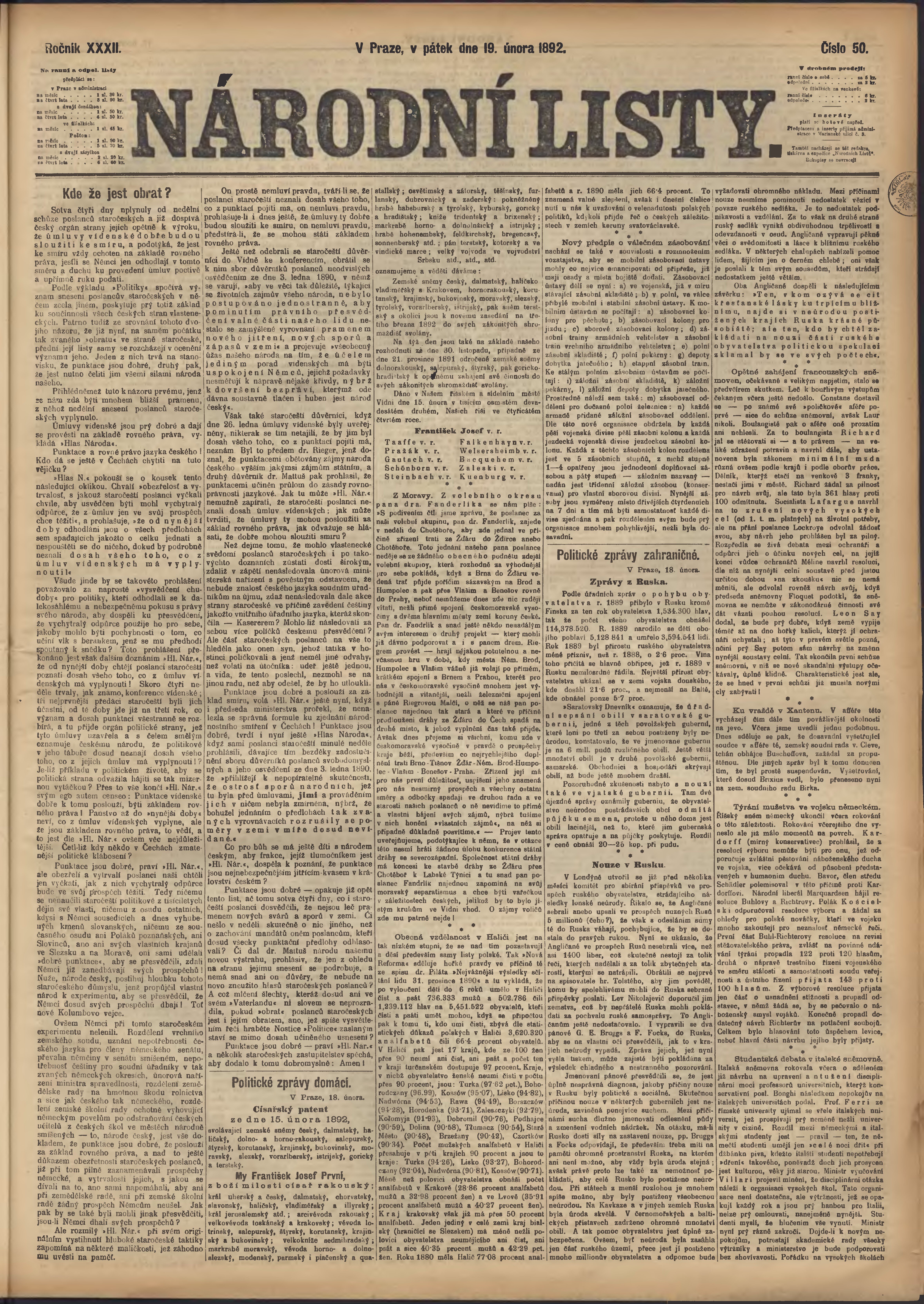 * Datum vydání výtisku: 19.2.1892 Číslo výtisku: 50