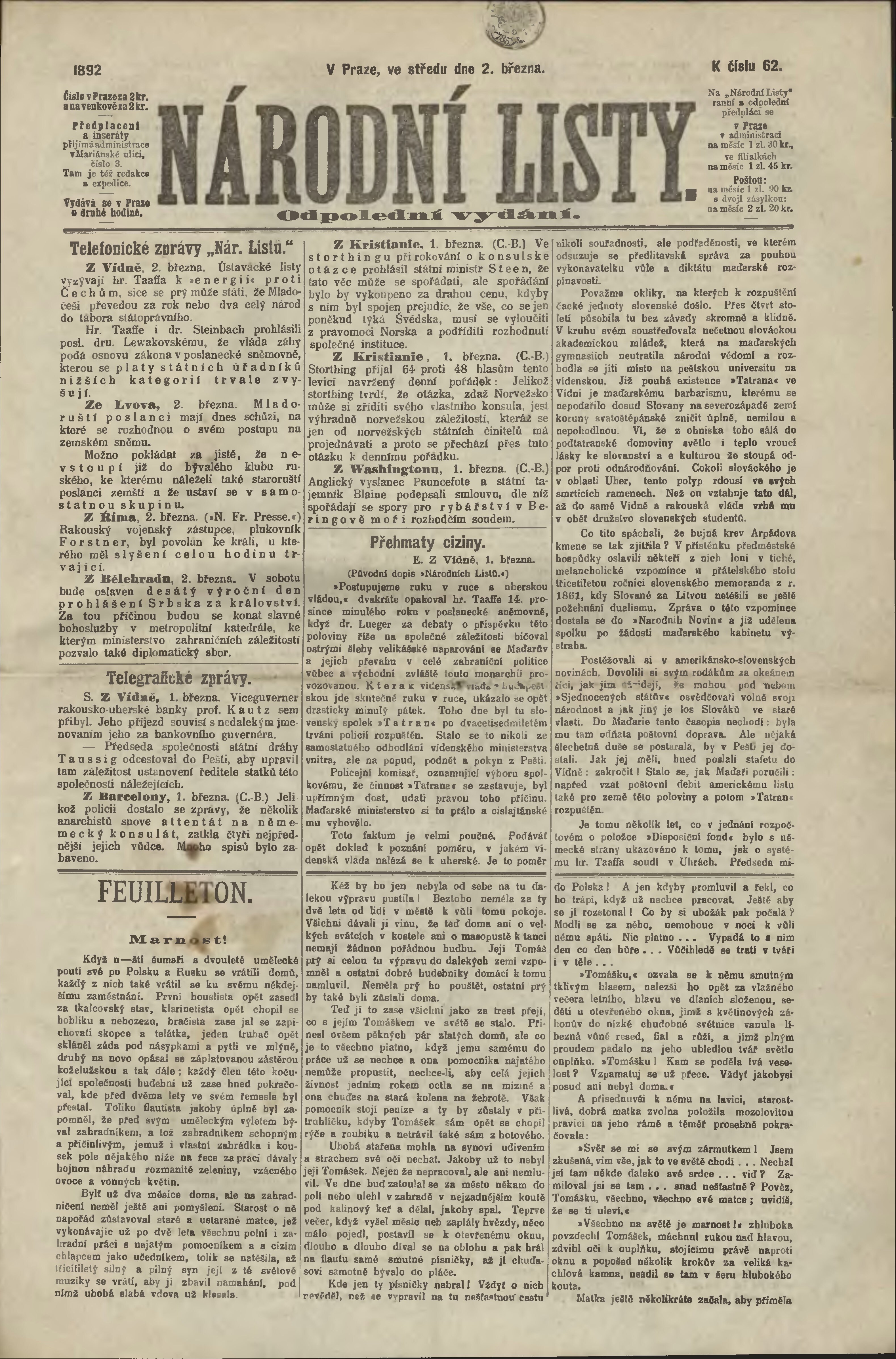 * Datum vydání výtisku: 2.3.1892 Číslo výtisku: 62 Poznámky k výtisku: odpolední vydání;