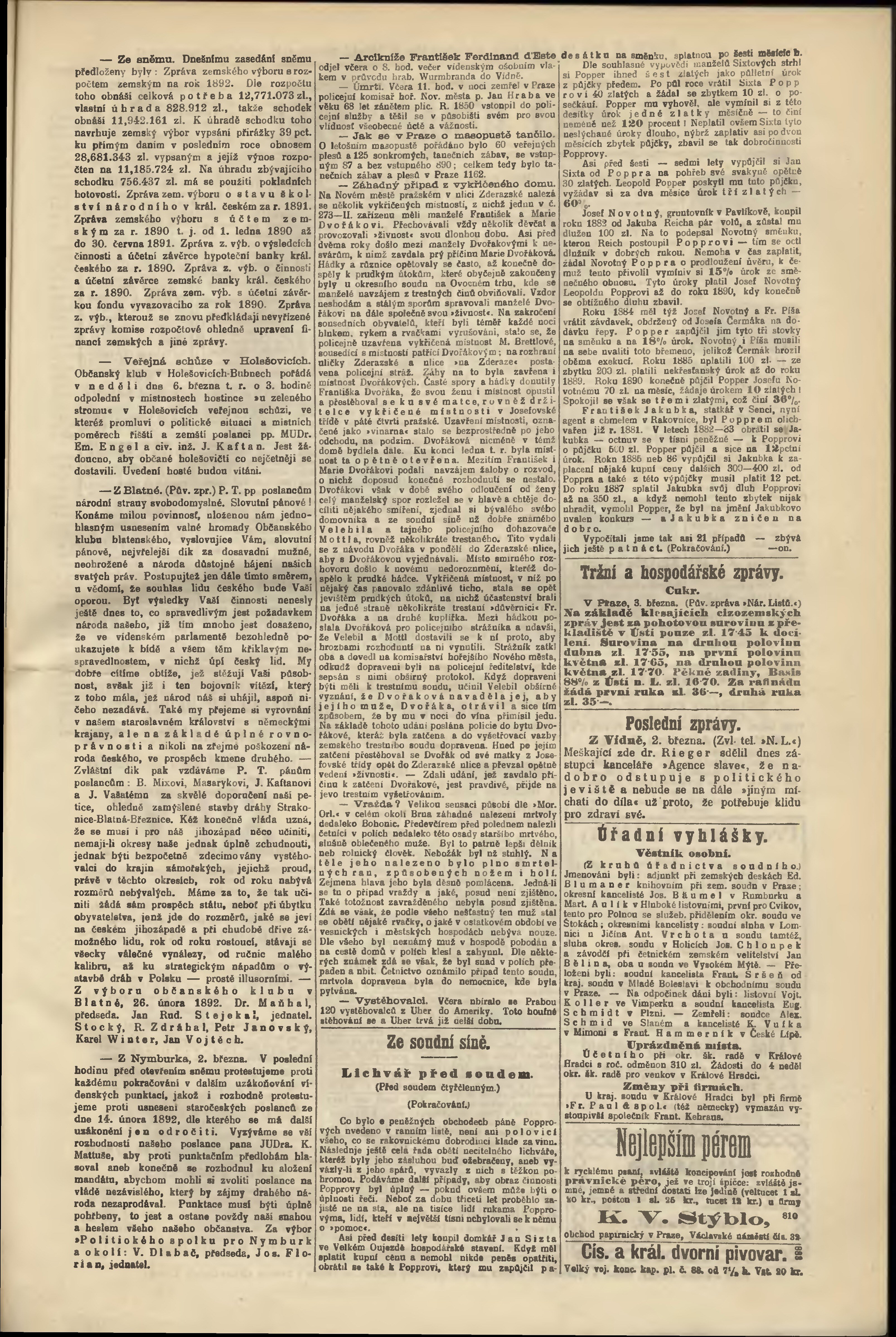 * Datum vydání výtisku: 2.3.1892 Číslo výtisku: 62 Poznámky k výtisku: odpolední vydání;
