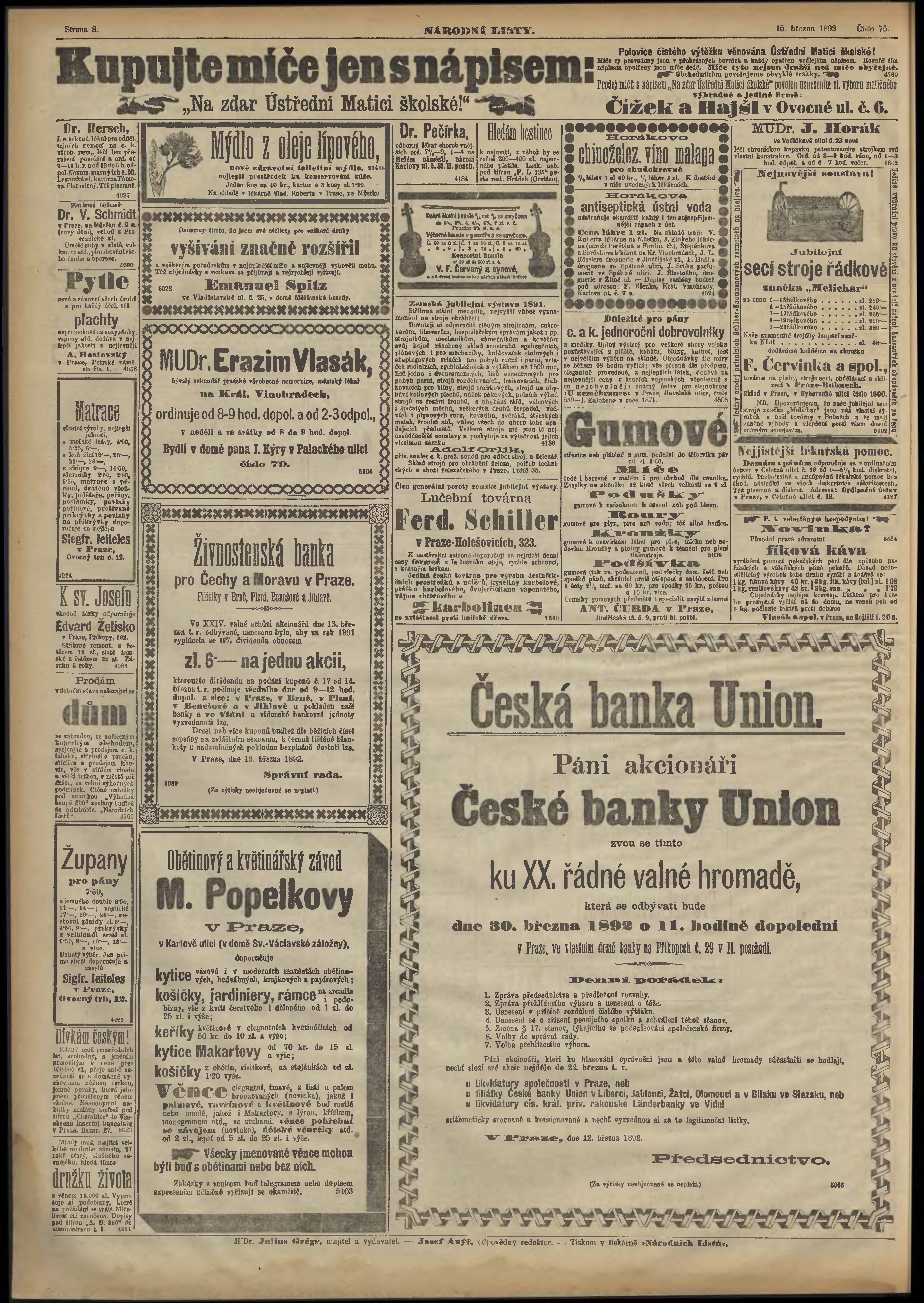 * Datum vydání výtisku: 15.3.1892 Číslo výtisku: 75