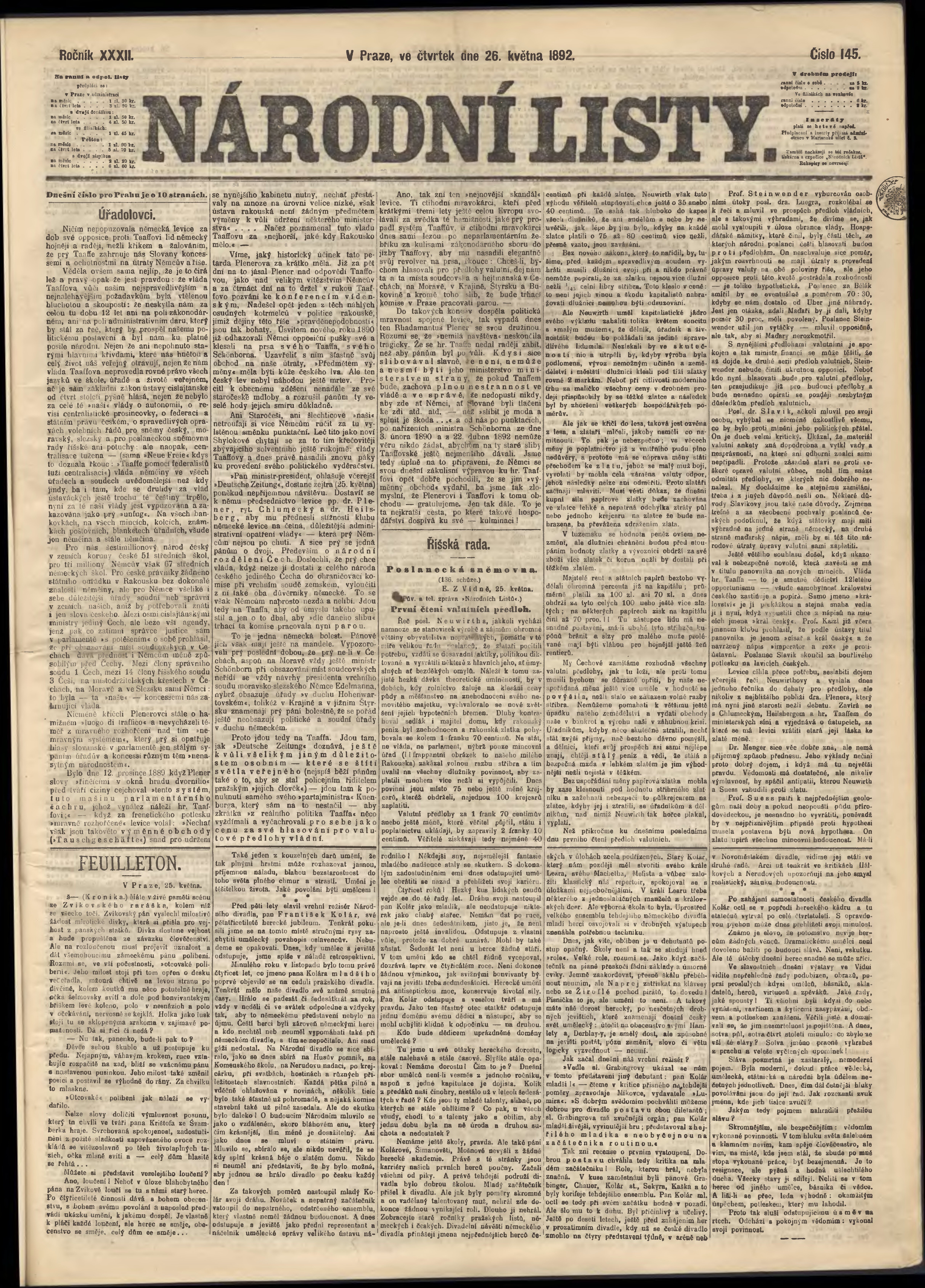 * Datum vydání výtisku: 26.5.1892 Číslo výtisku: 145