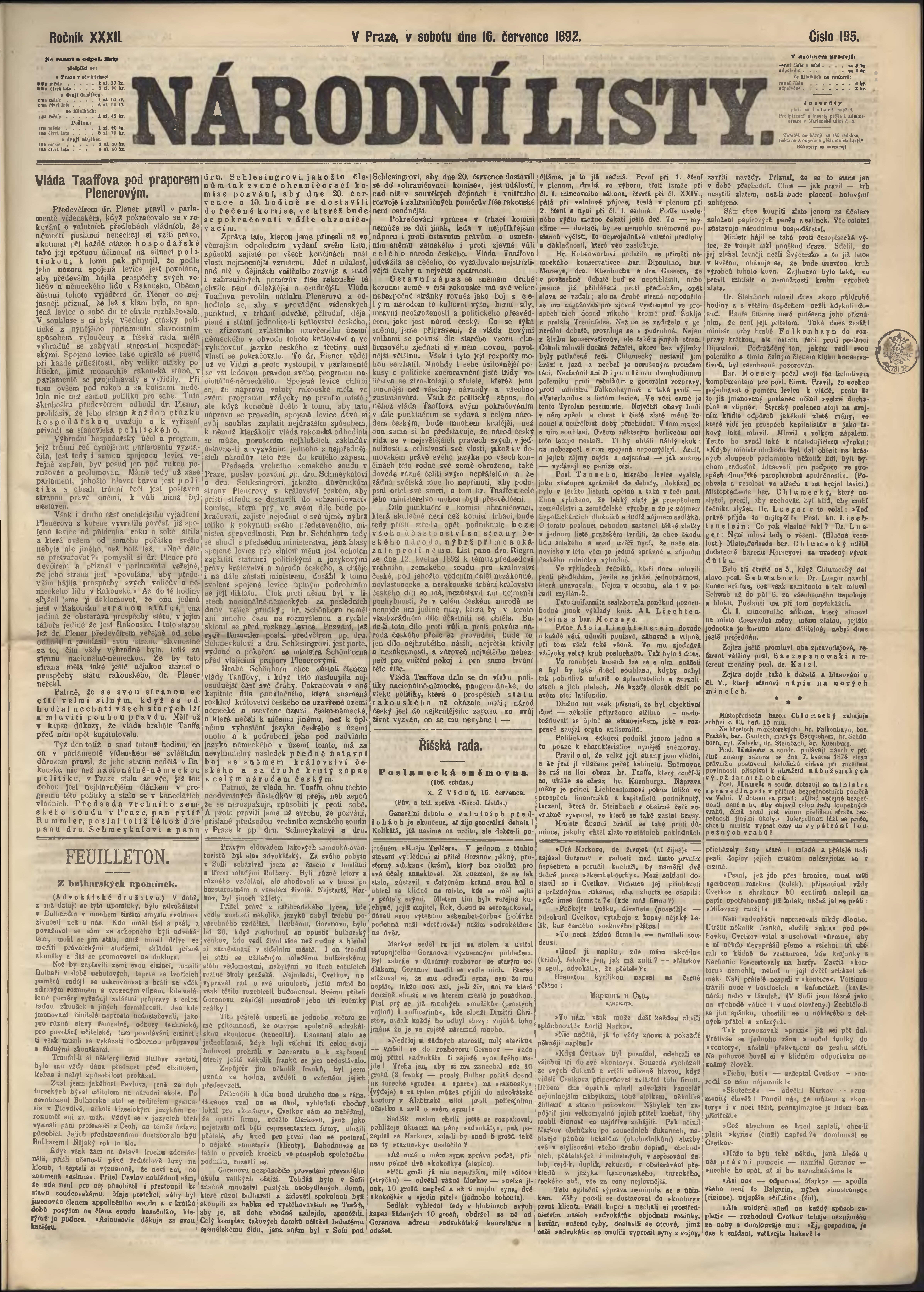 * Datum vydání výtisku: 16.7.1892 Číslo výtisku: 195