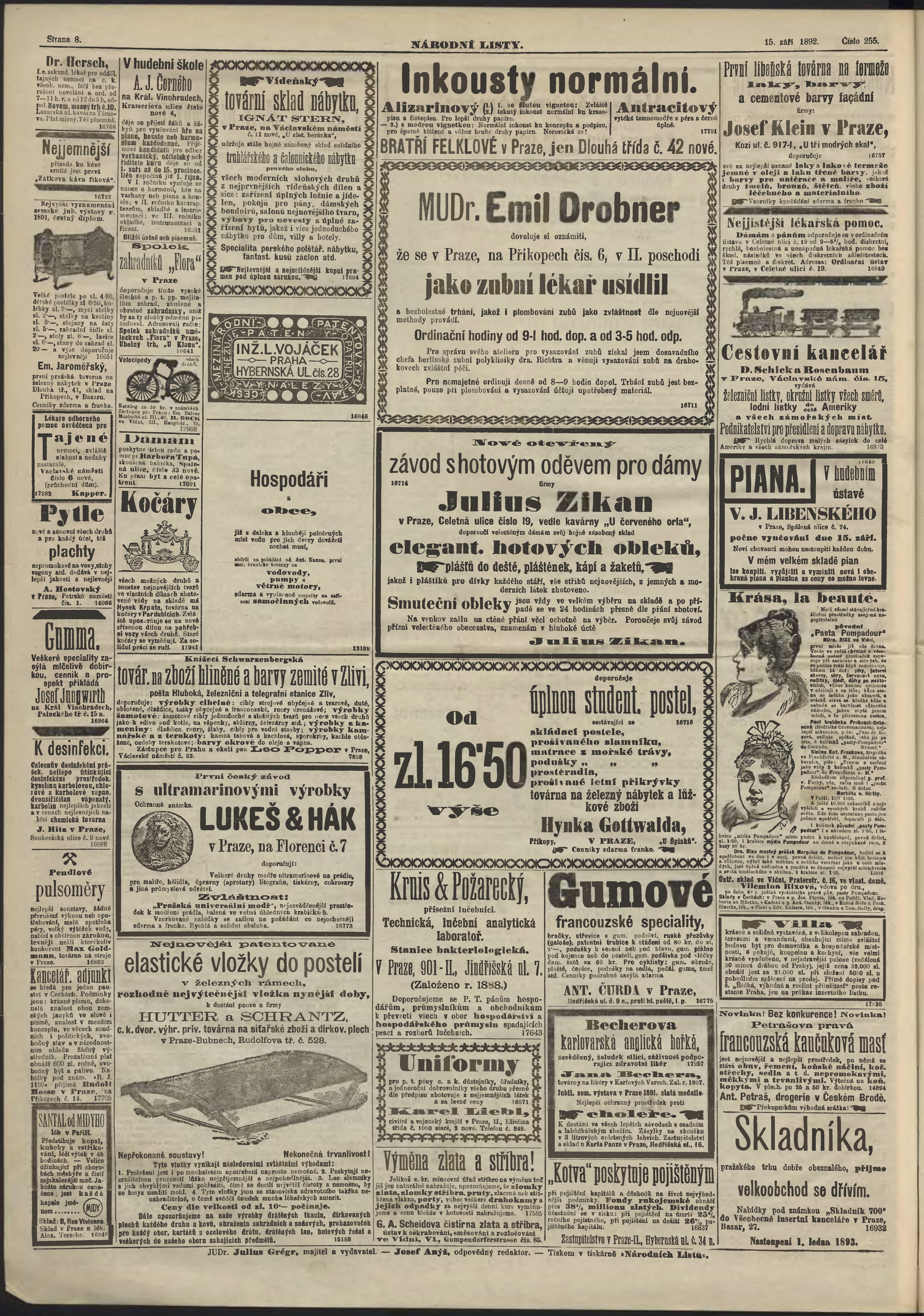 * Datum vydání výtisku: 15.9.1892 Číslo výtisku: 255