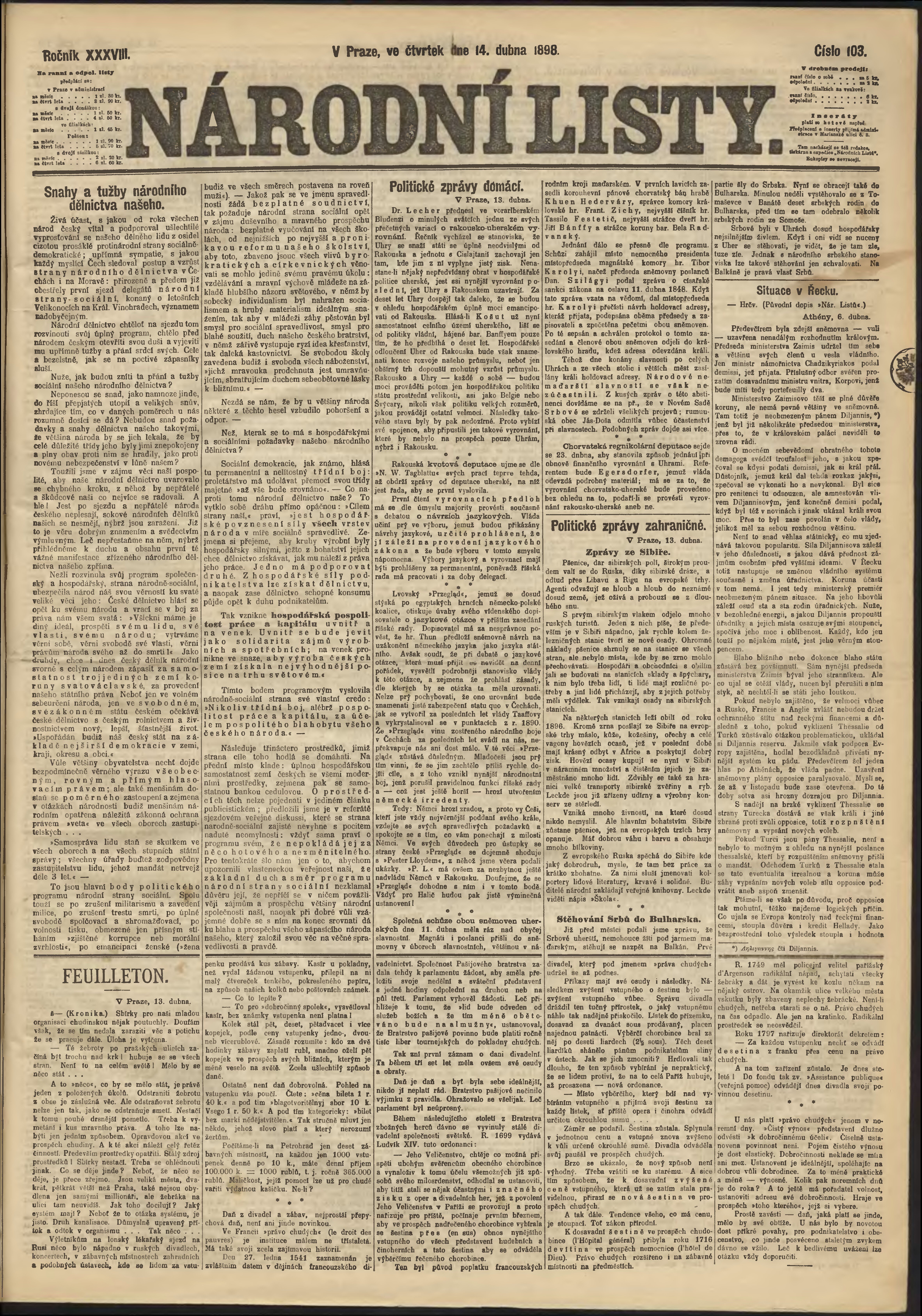 * Datum vydání výtisku: 14.4.1898 Číslo výtisku: 103