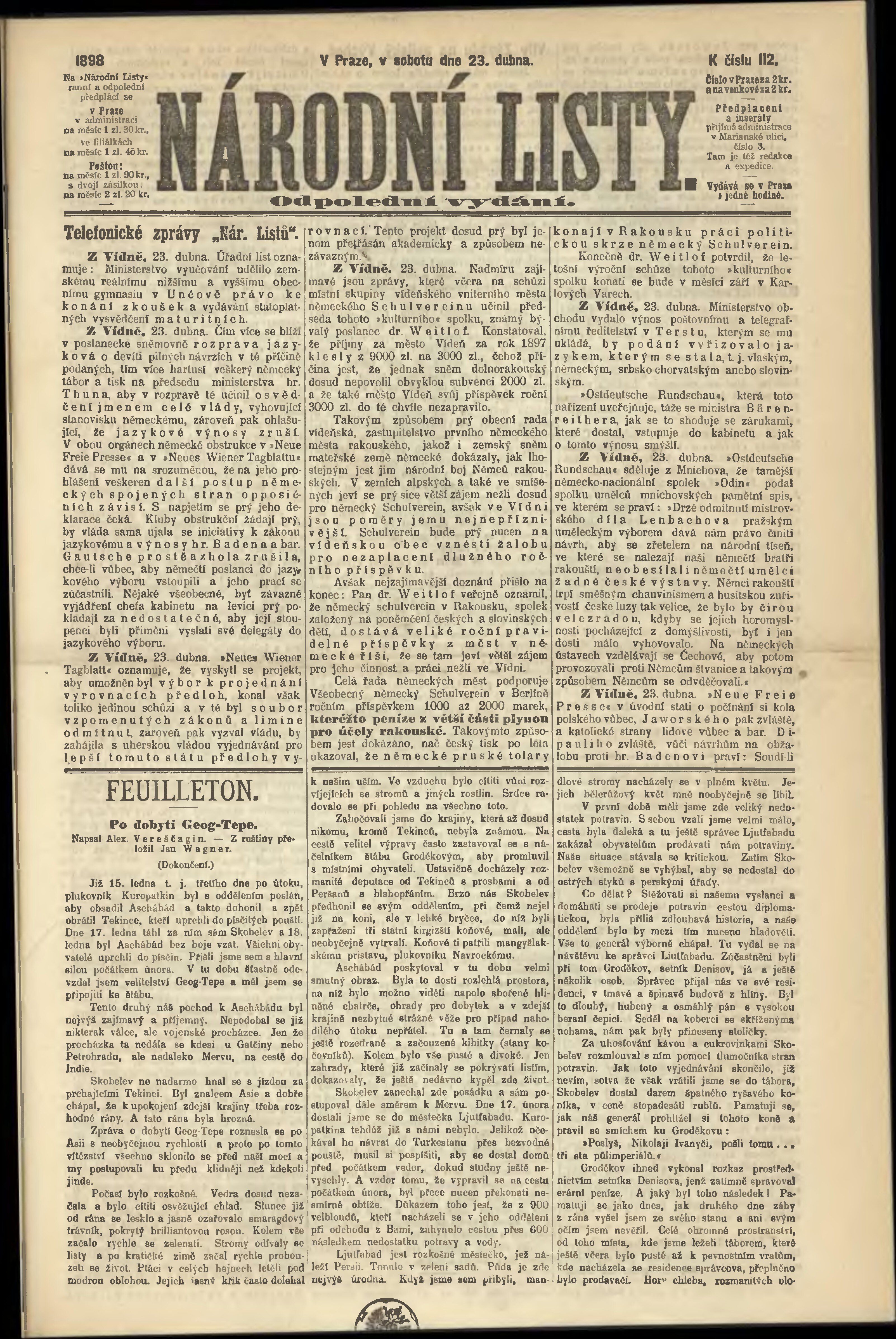 * Datum vydání výtisku: 23.4.1898 Číslo výtisku: 112 Poznámky k výtisku: odpolední vydání;