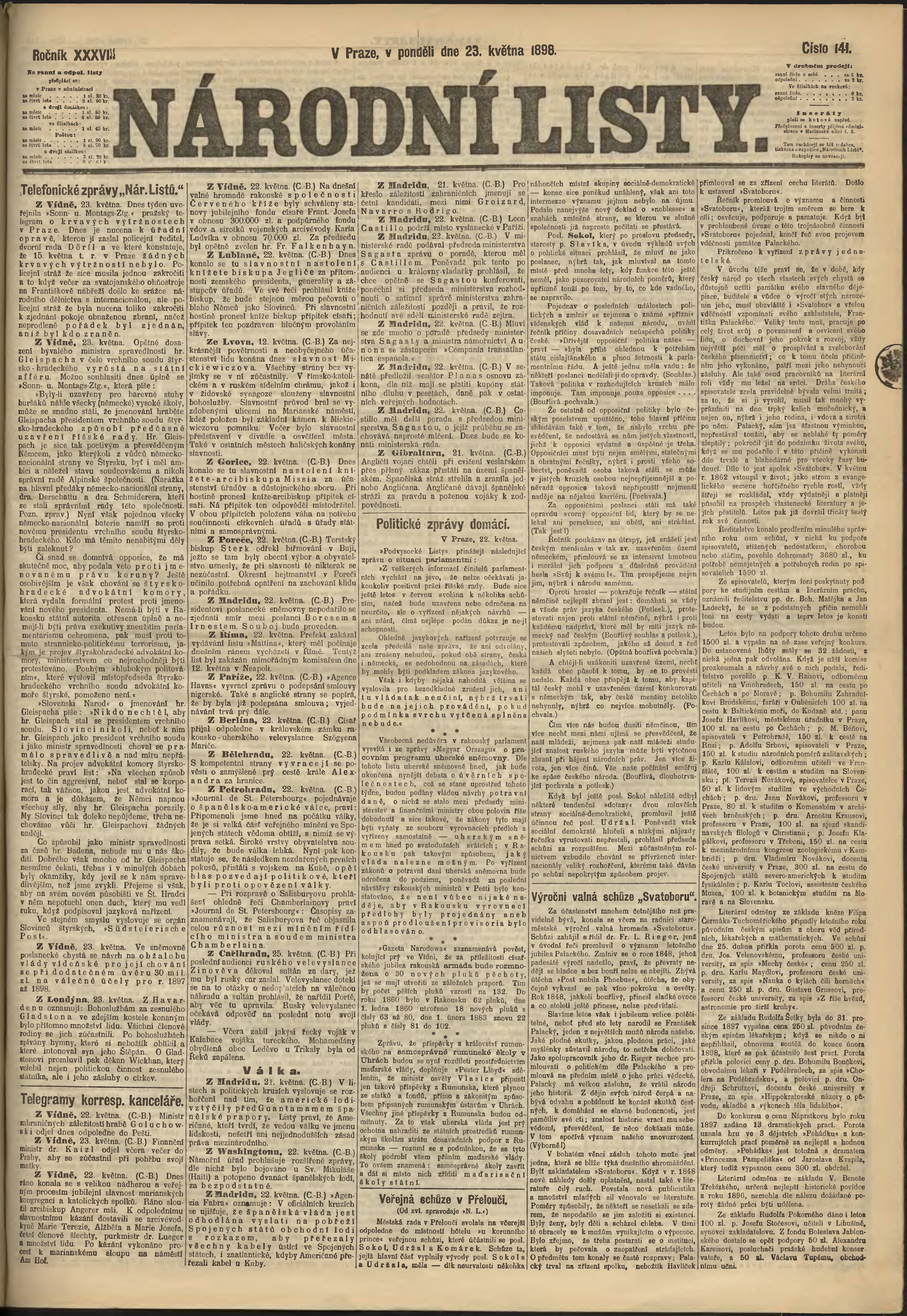 * Datum vydání výtisku: 23.5.1898 Číslo výtisku: 141