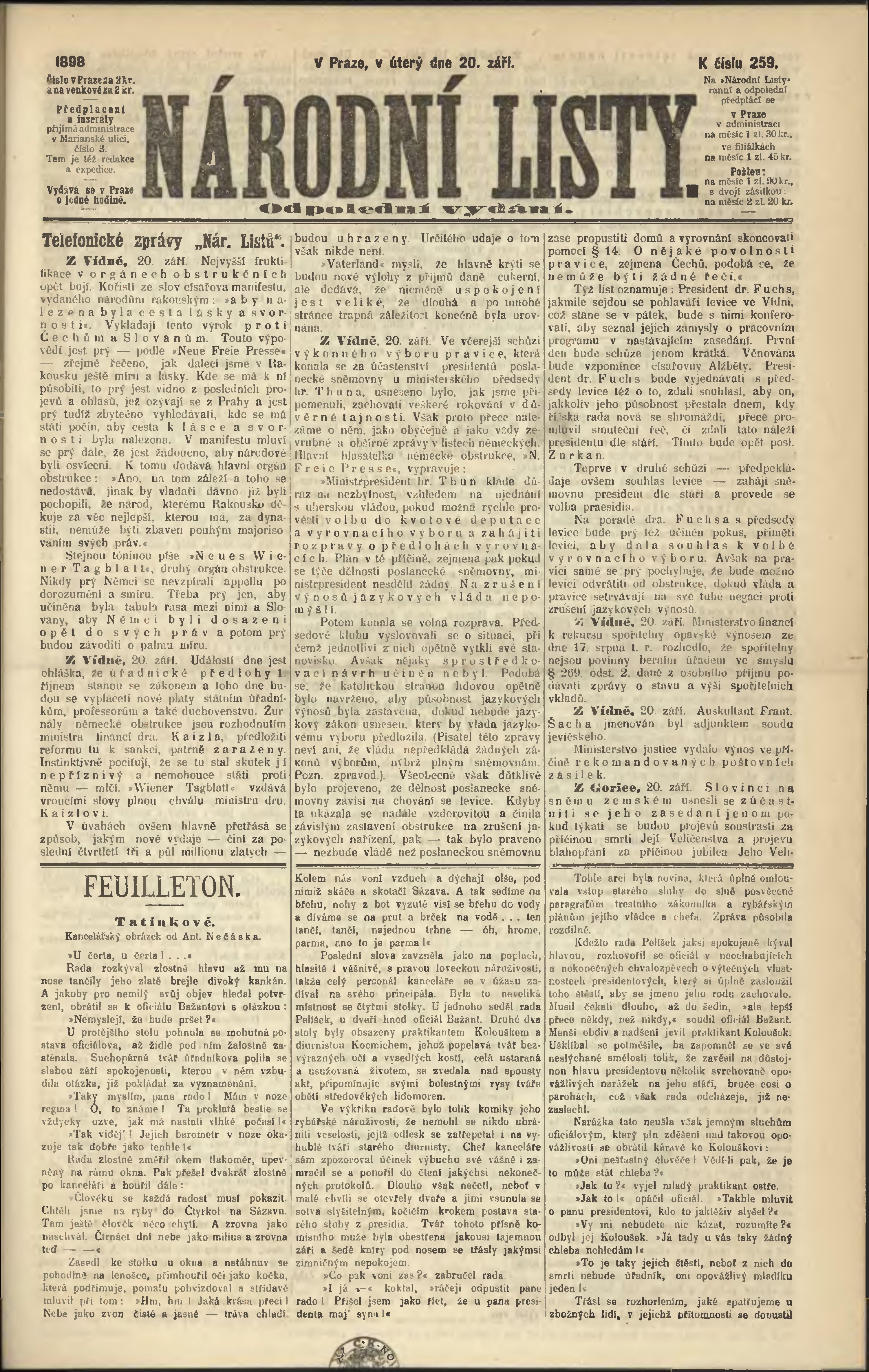 * Datum vydání výtisku: 20.9.1898 Číslo výtisku: 259 Poznámky k výtisku: odpolední vydání;