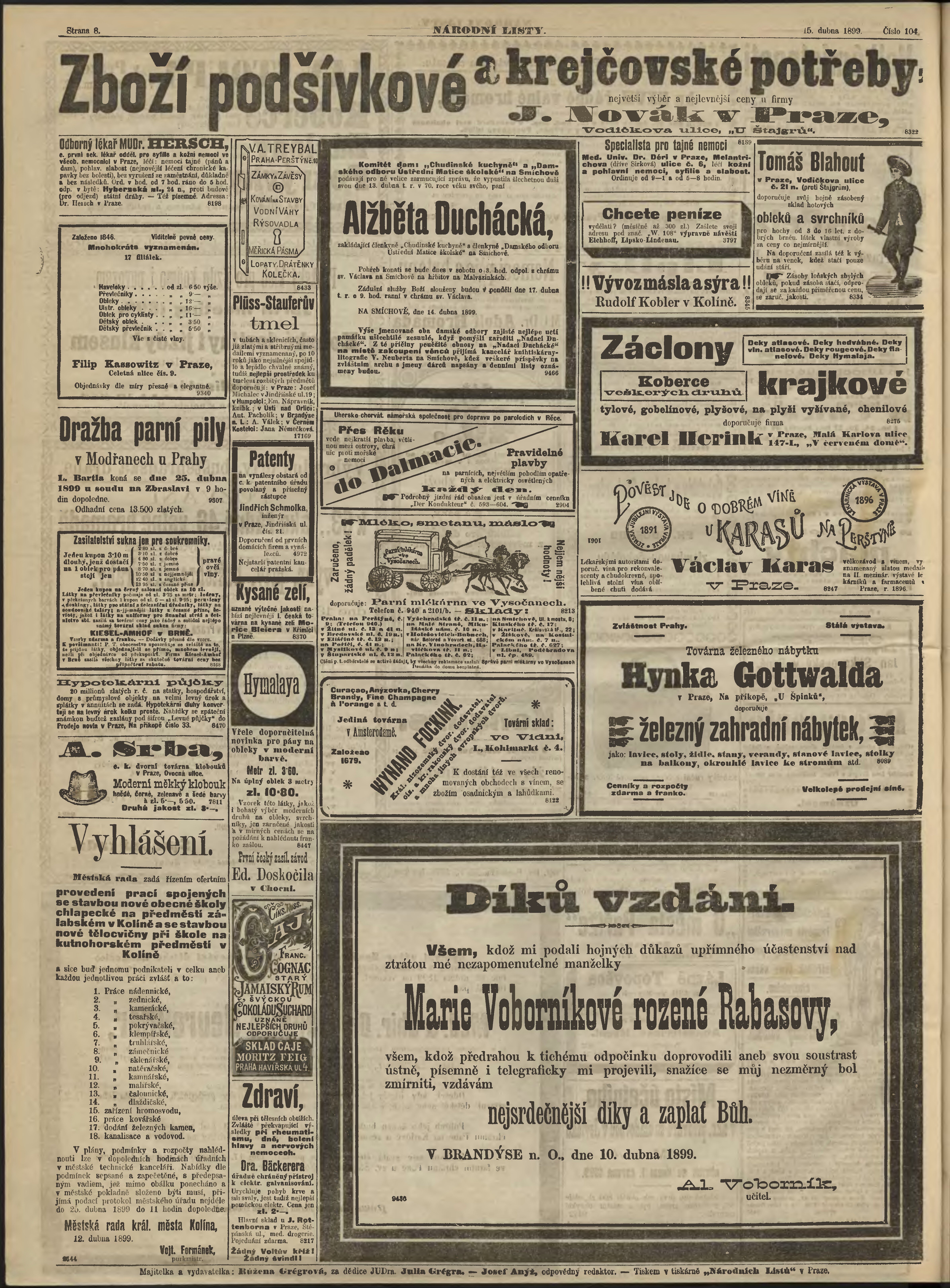 * Datum vydání výtisku: 15.4.1899 Číslo výtisku: 104 Poznámky k výtisku: ranní vydání;