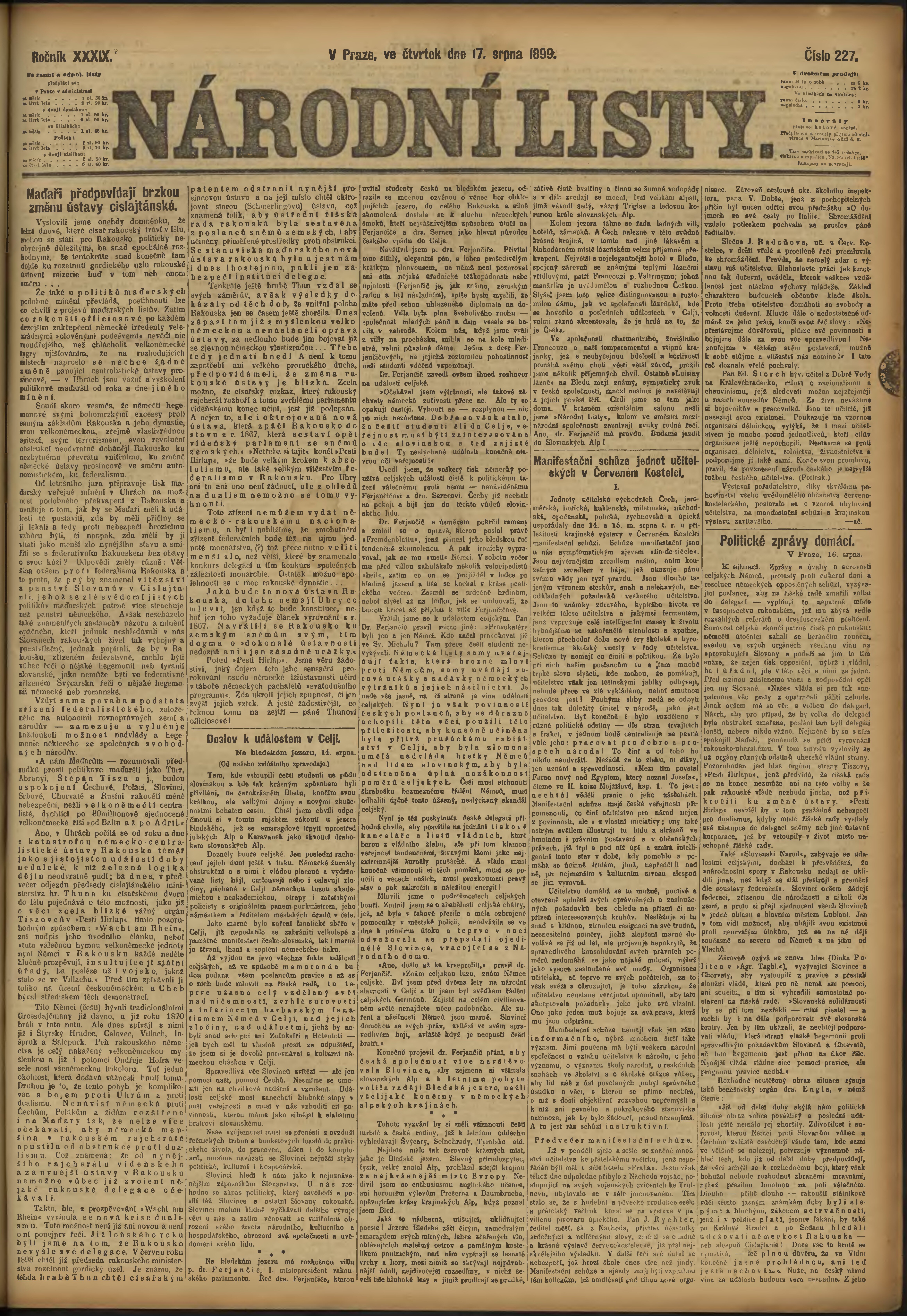* Datum vydání výtisku: 17.8.1899 Číslo výtisku: 227 Poznámky k výtisku: ranní vydání;