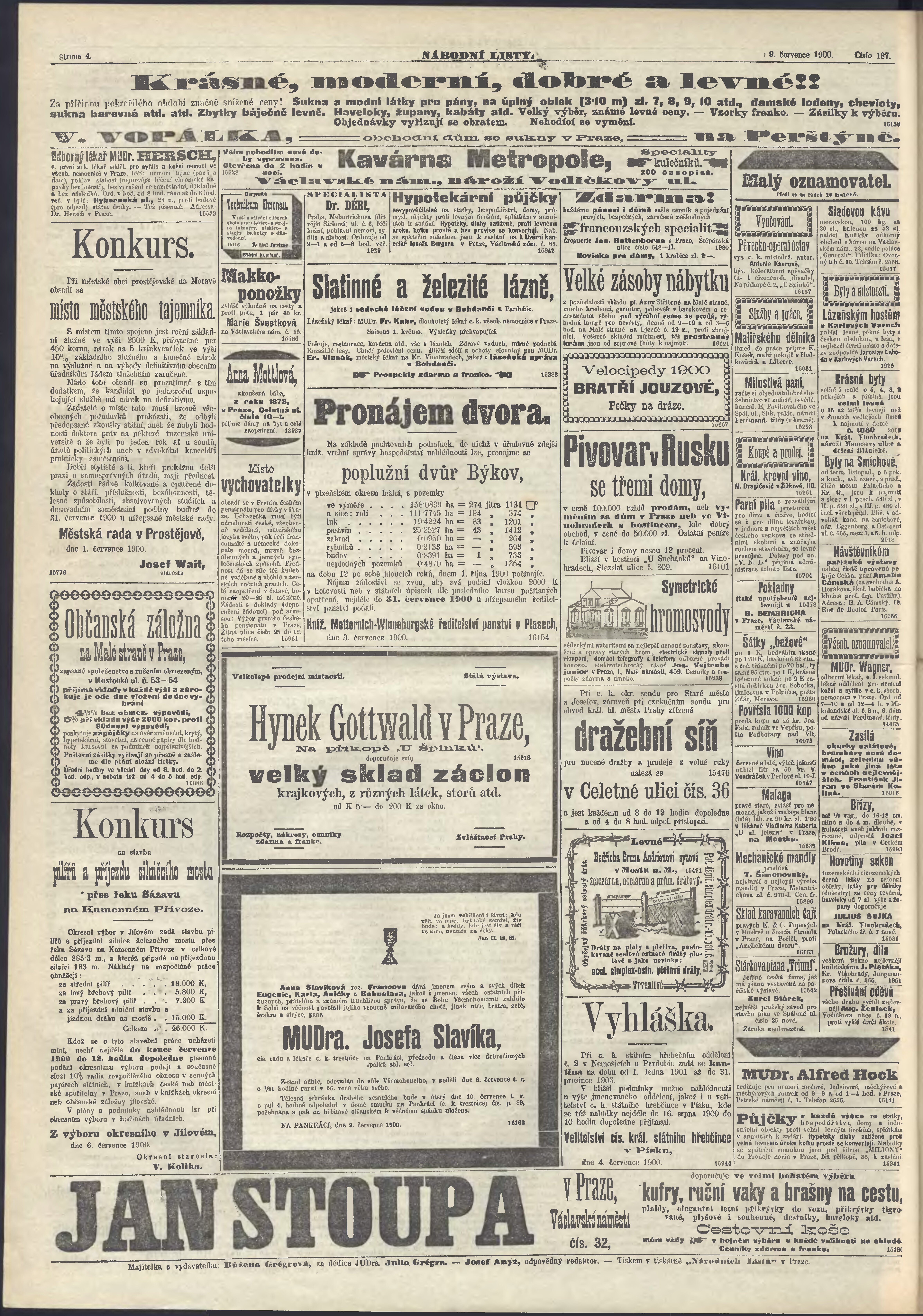 * Datum vydání výtisku: 9.7.1900 Číslo výtisku: 187 Poznámky k výtisku: ranní vydání;
