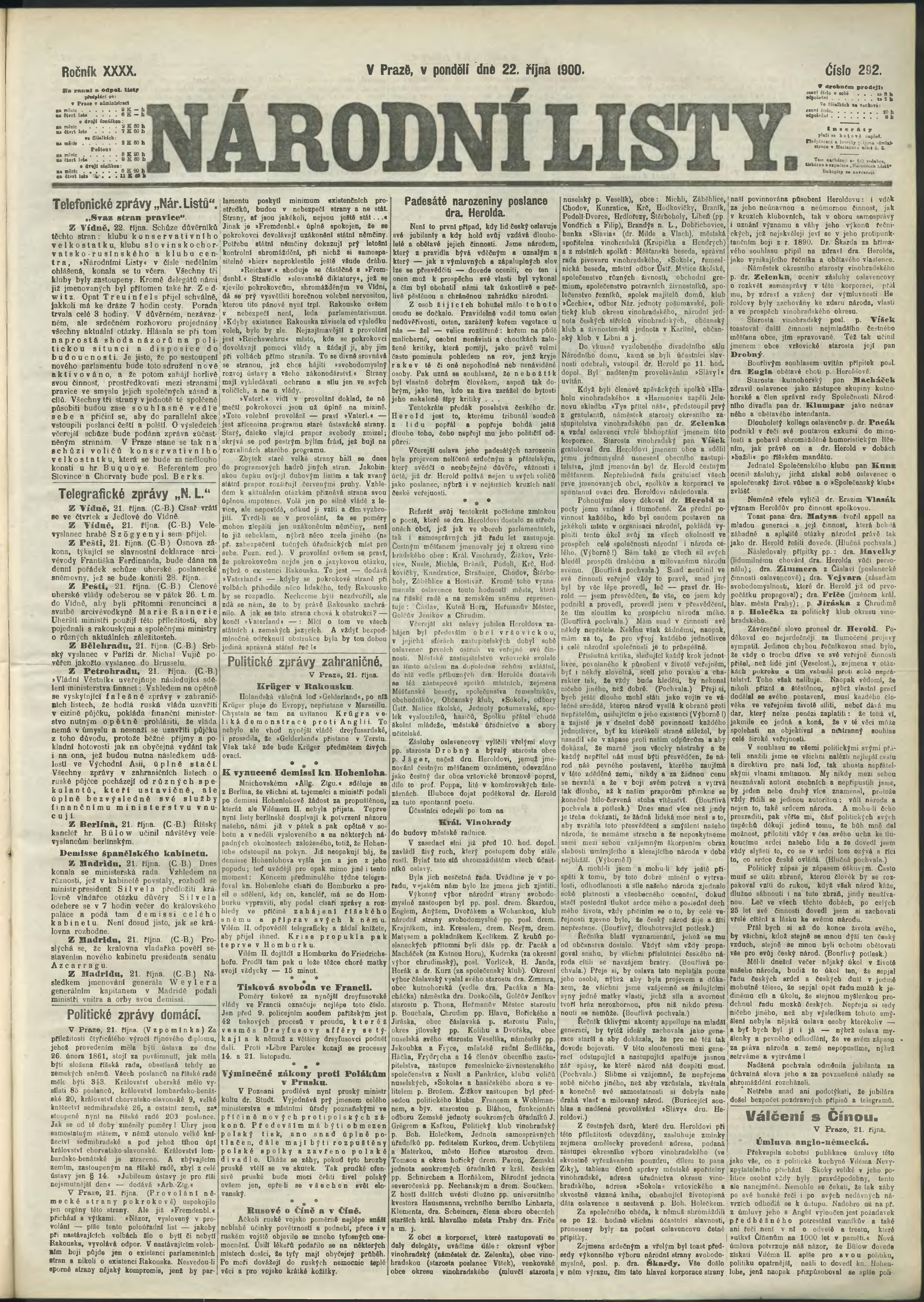 * Datum vydání výtisku: 22.10.1900 Číslo výtisku: 292 Poznámky k výtisku: ranní vydání;